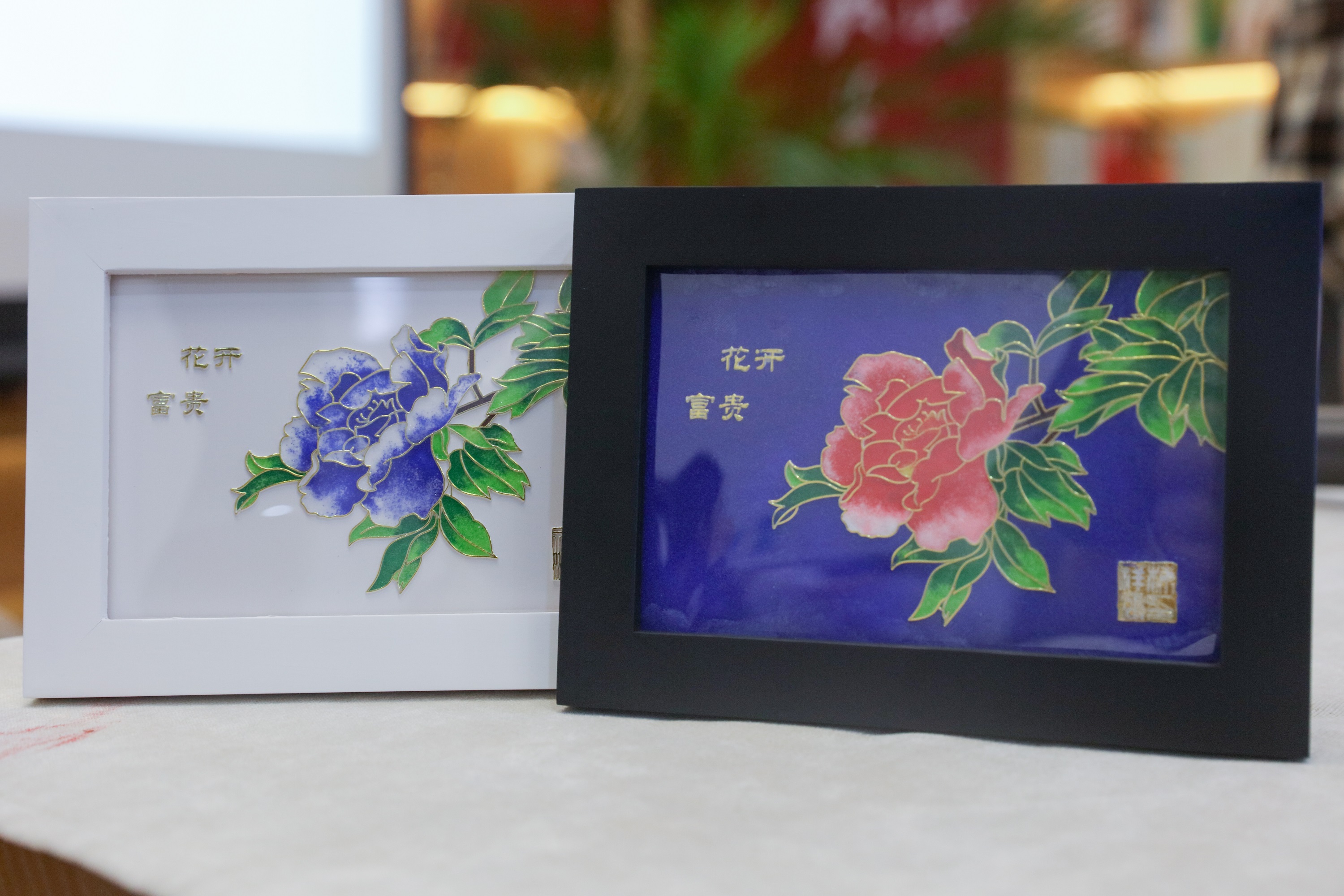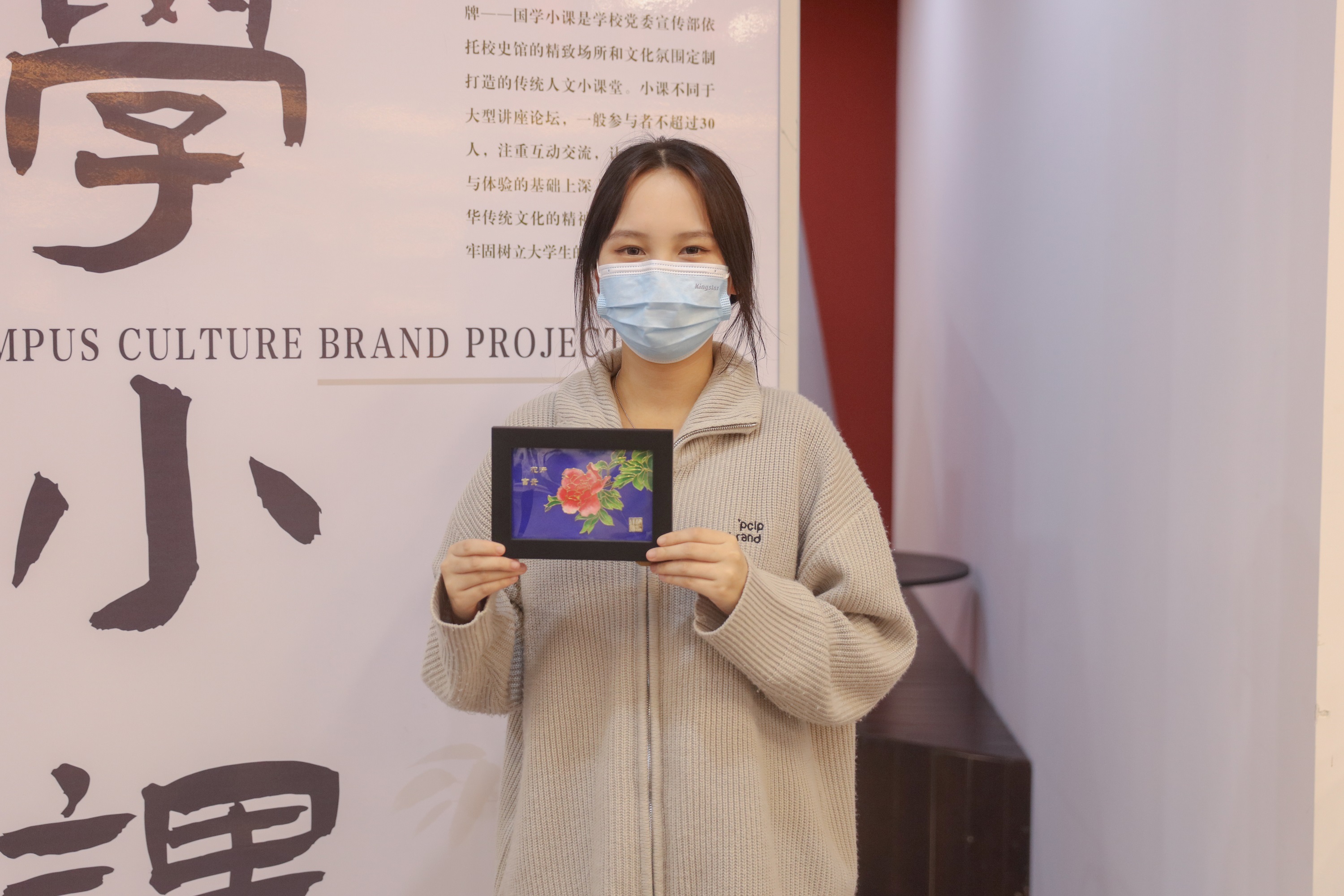 据了解,“点蓝”是最考验技艺的一道工序,制作者需要手持以铜制成的点蓝枪把碾细了的釉色填入铜丝边框内,以绘制自己想要的图案。艺术学院2021级动画专业的朱漪镝手握画铲,舀取所需的颜色,在画板上轻轻点抹,细细晕染。在完成花瓣部分的上色后,她选取淡粉色来勾线,每一笔的点划都有条不紊。为了让上色更加均匀,朱漪镝分区域不断点抹上色,多次重复,直到所填的颜料高度与铜丝的高度平齐。在画铲或立或斜中,色彩也随之在空白的画板上振翅飞舞,不一会儿,一朵牡丹就在她专注的点绘中呈现在了大家面前。在完成自己的作品后,朱漪镝激动地分享了自己的收获:“我认为这次非遗文化体验于我意义非凡,让我更深刻地感觉到颜色是多样多变的,这对我艺术方面的学习有很大帮助。我在尝试将景泰蓝珐琅掐丝画技艺对于颜色的理解融入到平时的色彩绘画中,如果顺利的话,一定是不错的体验。”