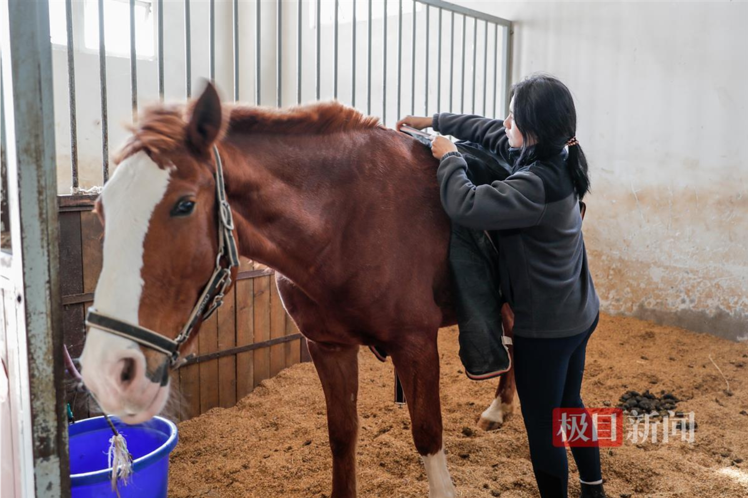 “马儿穿上马衣和人穿上衣服的感觉是一样的,穿得太紧会限制马的活动,让马儿感觉到不舒服,穿得太松又会透风进去,因此要调整好马衣的位置,在保暖的同时做到舒适。”2022级社会体育专业(赛马产业管理方向)的学生李雨萱说,给马穿马衣是马术专业学生的必备技能,进校三个月以内,她就已经熟练掌握了为马儿穿衣的技巧。