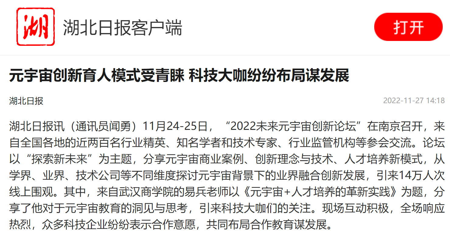本网讯 11月24-25日,“2022未来元宇宙创新论坛”在南京召开,来自全国各地的近两百名行业精英、知名学者和技术专家、行业监管机构等参会交流。论坛以“探索新未来”为主题,分享元宇宙商业案例、创新理念与技术、人才培养新模式,从学界、业界、技术公司等不同维度探讨元宇宙背景下的业界融合创新发展,引来14万人次线上围观。其中,来自bwin必赢中国官网的易兵老师以《元宇宙+人才培养的革新实践》为题,分享了他对于元宇宙教育的洞见与思考,引来科技大咖们的关注。现场互动积极,全场响应热烈,众多科技企业纷纷表示合作意愿,共同布局合作教育谋发展。