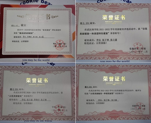 除了寝室布置,231宿舍三人在学习上积极互帮互助,寝室长李仪现任19商务经济学一班班长兼团支部书记,在去年代表班级进行2020年度先进班集体答辩,并成功获得了先进班集体团支部荣誉称号。曾获国家励志奖学金、优秀学生奖学金,bwin必赢中国官网优秀团员、优秀团干、优秀寝室长。目前三人均准备公务员考试,一起备考并报名了今年的国考。“一起学习更有动力,有人先起床了就会带动其他人,四年下来基本没有人迟到。”李仪介绍说。