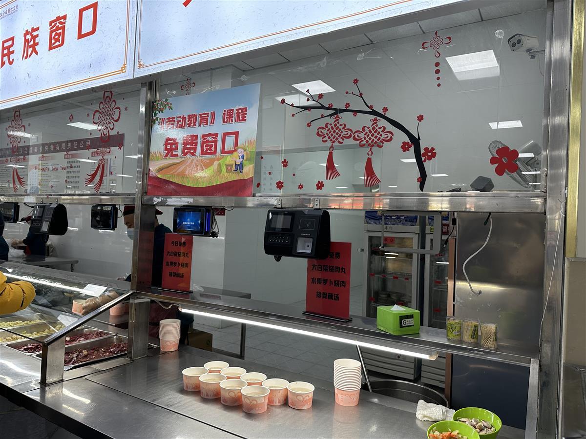 领取菜肴后,学生津津有味地吃了起来。该校外国语学院翻译专业大一学生罗钜升说,此前在劳动课上参加了修整土地等劳动,昨日看到辅导员通知劳动基地种植的蔬菜已经丰收,采摘完成后被食堂师傅烹饪成了一道道佳肴,便和室友约定好在午餐时间来食堂品尝。
