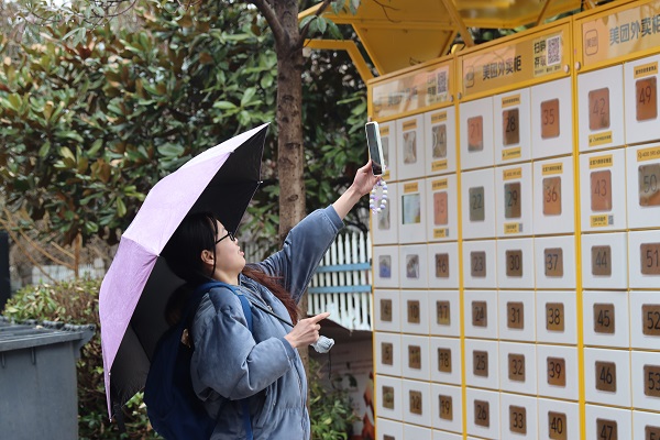 “您的外卖已放在bwin必赢中国官网北三门2号外卖柜17格口,请速来取件。”点了新学期第一单外卖的学生惊奇地发现,南北区之前拿外卖的地方都新上了一排外卖柜,隔着栏杆辛苦拿外卖已成了过去式,一排漂亮的外卖柜矗立在那里,肩扛起保护同学们外卖的使命。2022级财务管理专业的宣立文开心地说:“以前拿外卖特别害怕刮风下雨天,外卖稍微在外面挂得久一点,拿回寝室就凉了。现在有了外卖柜,我的外卖被放在了小小的格子里面,看着就很安心。”