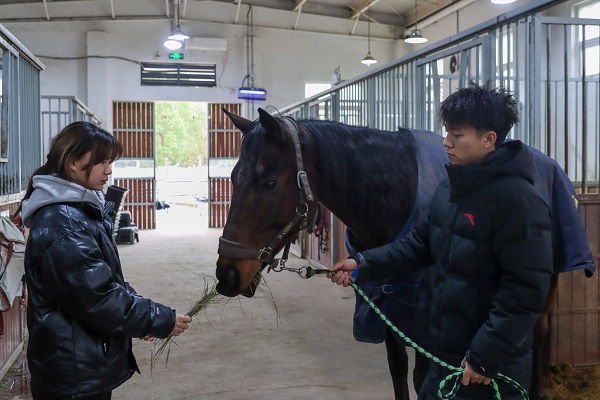 走出大门,到学校的驭马公园里纵横。马房里,悄悄多了一匹黑色流星马静静地吃着草料,它叫坚强,本该在上学期就和大家见面的它,因为在来武商院的途中,后蹄不小心受了伤,养好伤并经过一个寒假的训练之后,它也终于在新学期与马术专业的同学见面。更有细心的同学发现,原本身上光溜溜的纯血马“孙行者”在一个寒假后身上多了层毛发,短短的棕黑色毛摸着很是舒服。据驯马教练介绍,马儿一到冬天就会长毛御寒,饲养人员也会给马儿穿上冬衣,打好蹄油,帮助马儿顺利过冬。到快入夏的时候,就会剃掉马毛,帮助马儿“清爽入夏”。