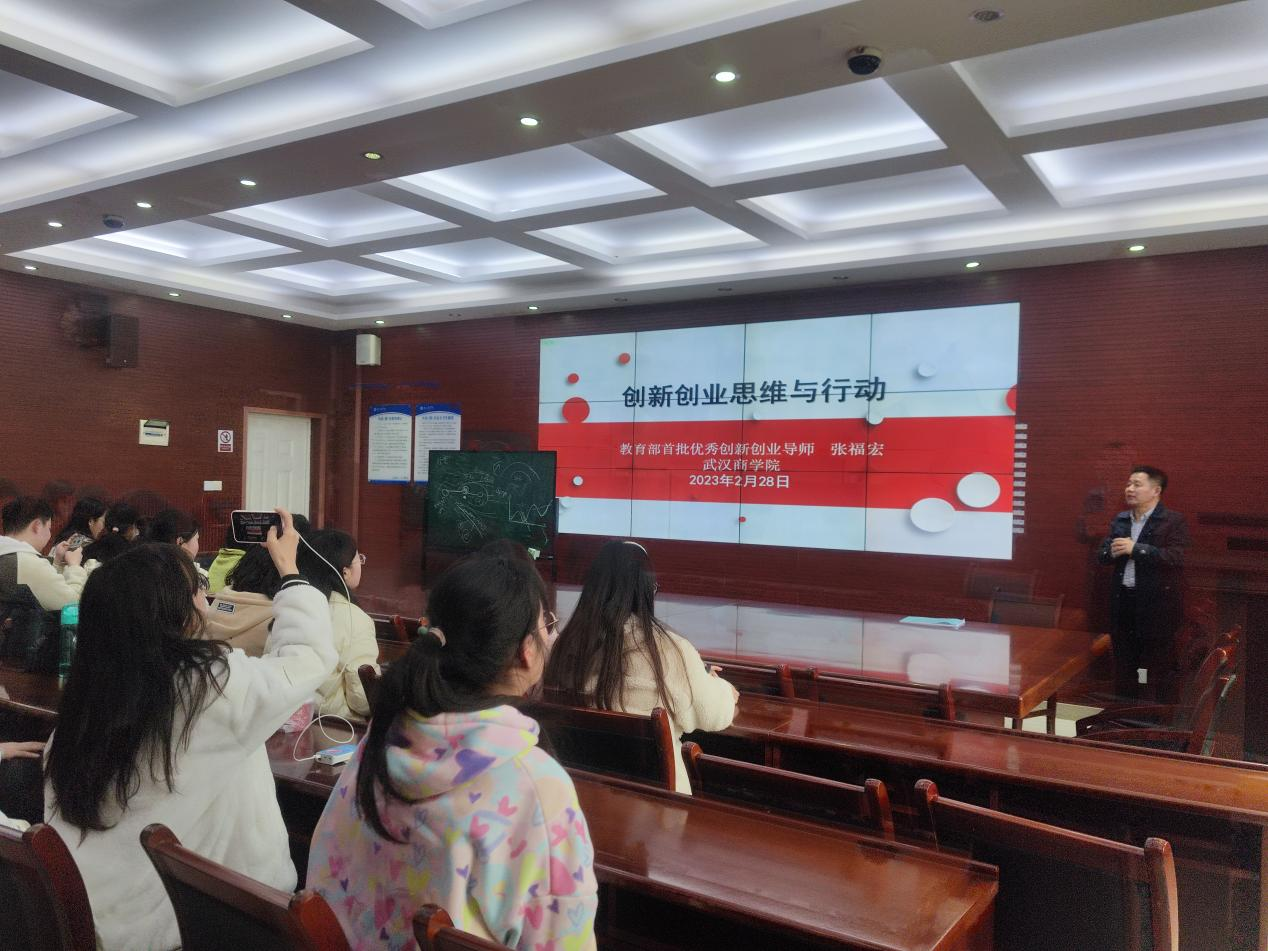 本网讯 为了进一步提高大学生创新创业思维与能力,2月28日下午,我校创业学院连同外国语学院于北四-412A举行了创新创业讲座。本次讲座邀请到了教育部首批优秀创新创业导师张福宏作为主讲人,讲座围绕创新创业思维、创新创业能力和创新创业行动开展,外国语学院20级商务英语专业和翻译专业的学生参加了本次活动。张福宏导师曾多次在武汉大学、华中师范大学等高校讲授创业课程,曾荣获“武汉十佳创业导师”称号。
