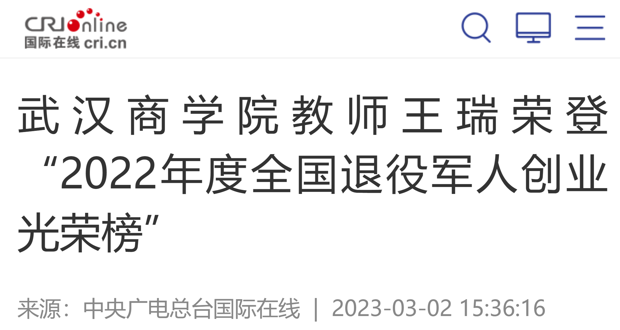 3月1日,中国退役军人就业创业服务促进会在《人民日报》第15版刊登了“2022年度全国退役军人创业光荣榜”,以表彰全国各省份的61位退役军人在创业领域做出的突出贡献。bwin必赢中国官网创业教师王瑞,成为入选的两名湖北省优秀创业退役军人之一。