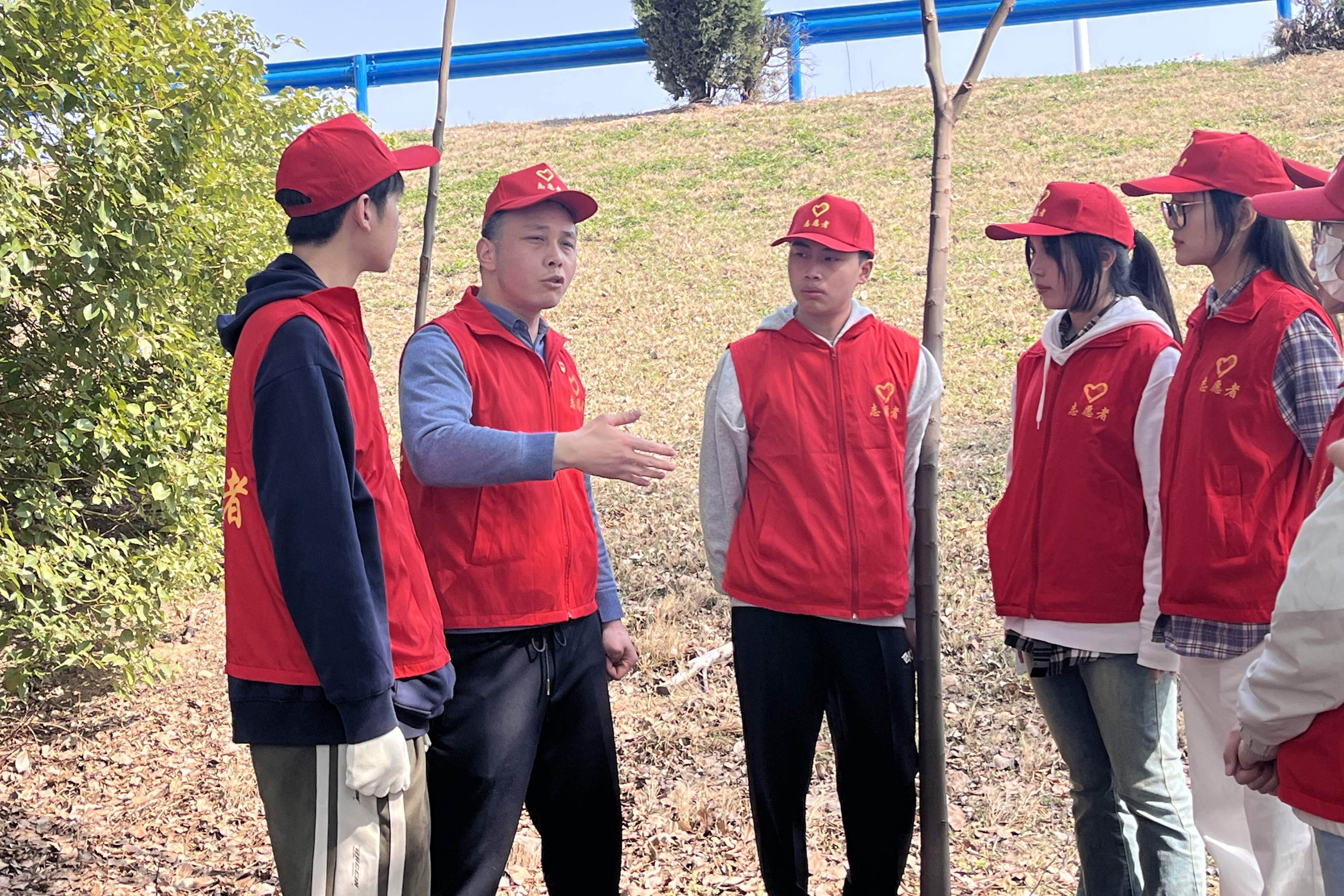 参加志愿服务活动的,除了学生,还有一位特殊的老师。2020年,我校成立了防汛工作突击队,25名教职工主动请战,承担起苕窝子险段2000余米的堤坝巡险任务。队员之一的王章鹏老师,走下坝去为学生们讲述这段特殊的故事。“苕窝子地段是二级堤坝,容易出险,当时我们25个人在这里坚持了近一个月,每天要走四个来回巡堤。”王章鹏说,当时天气炎热,气温逼近40度,走一个来回胶靴里都能倒出水来,手机里的计步器每天能走到30000多步。在王章鹏的手机相册里,仍保留着当初守堤的照片,其中一根一头圆滑、一头分叉的“奇怪”木棍引起了在场学生的好奇。“这是‘秘密武器’,用棍子圆滑一头捅下去,分叉的头子可以快速拨开周围的杂草和树枝,方便查看险情情况;在清理水中垃圾时,分叉的一头可以准确地把垃圾卡住,更快把垃圾清理上岸,不耽误时间。”王章鹏说。自2021年开始,我校成为苕窝子险段生态环境保护的“常客”,并每年安排志愿者来开展生态保护活动。