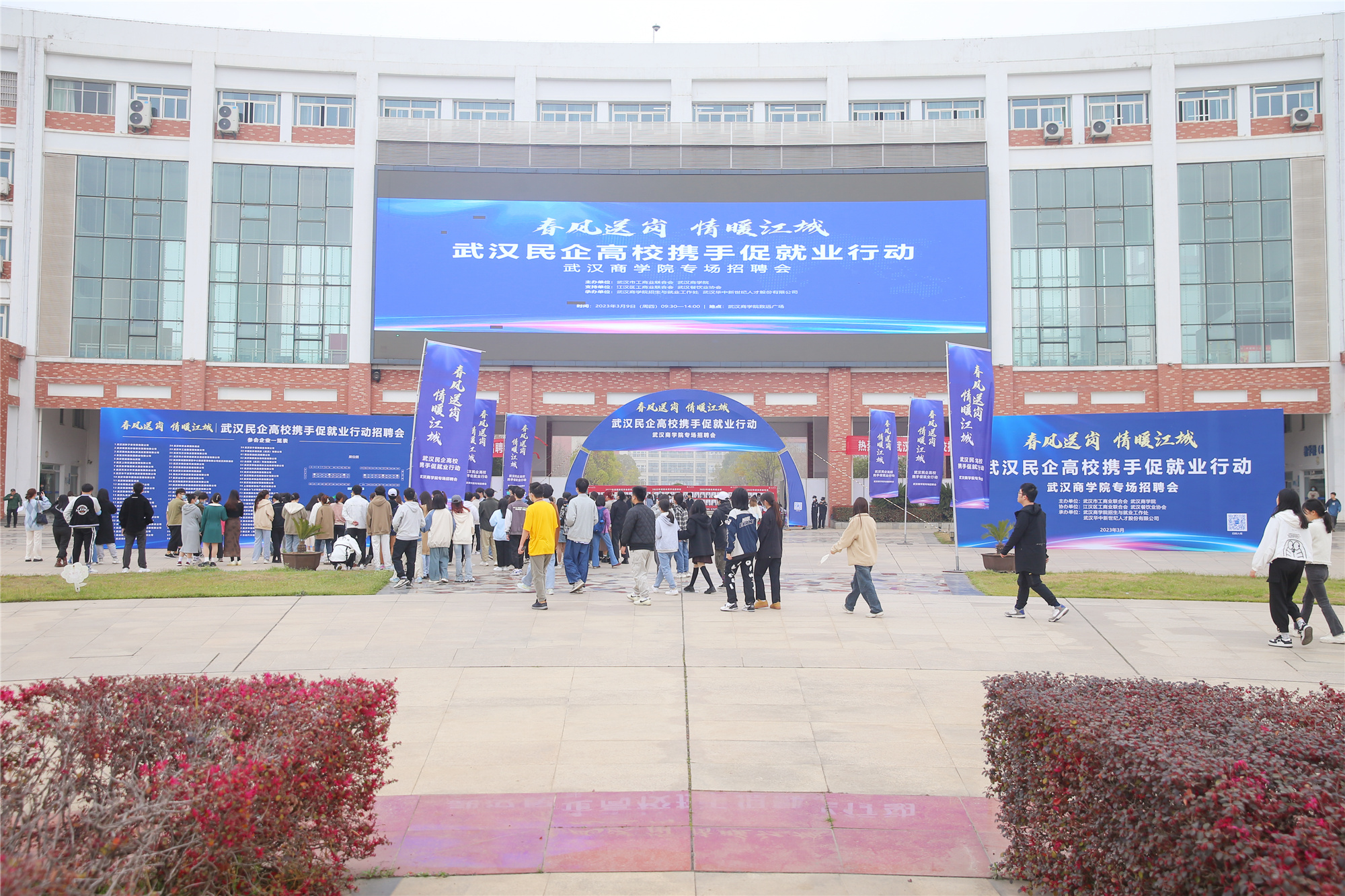 春风送岗,情暖江城。3月9日上午,武汉市工商业联合会携手我校共同举办的春季校园专场招聘会在致远广场顺利展开。84家参会企业提供1899个岗位,2400余名毕业生投递简历超5000份,达成初步就业意向的近400人。