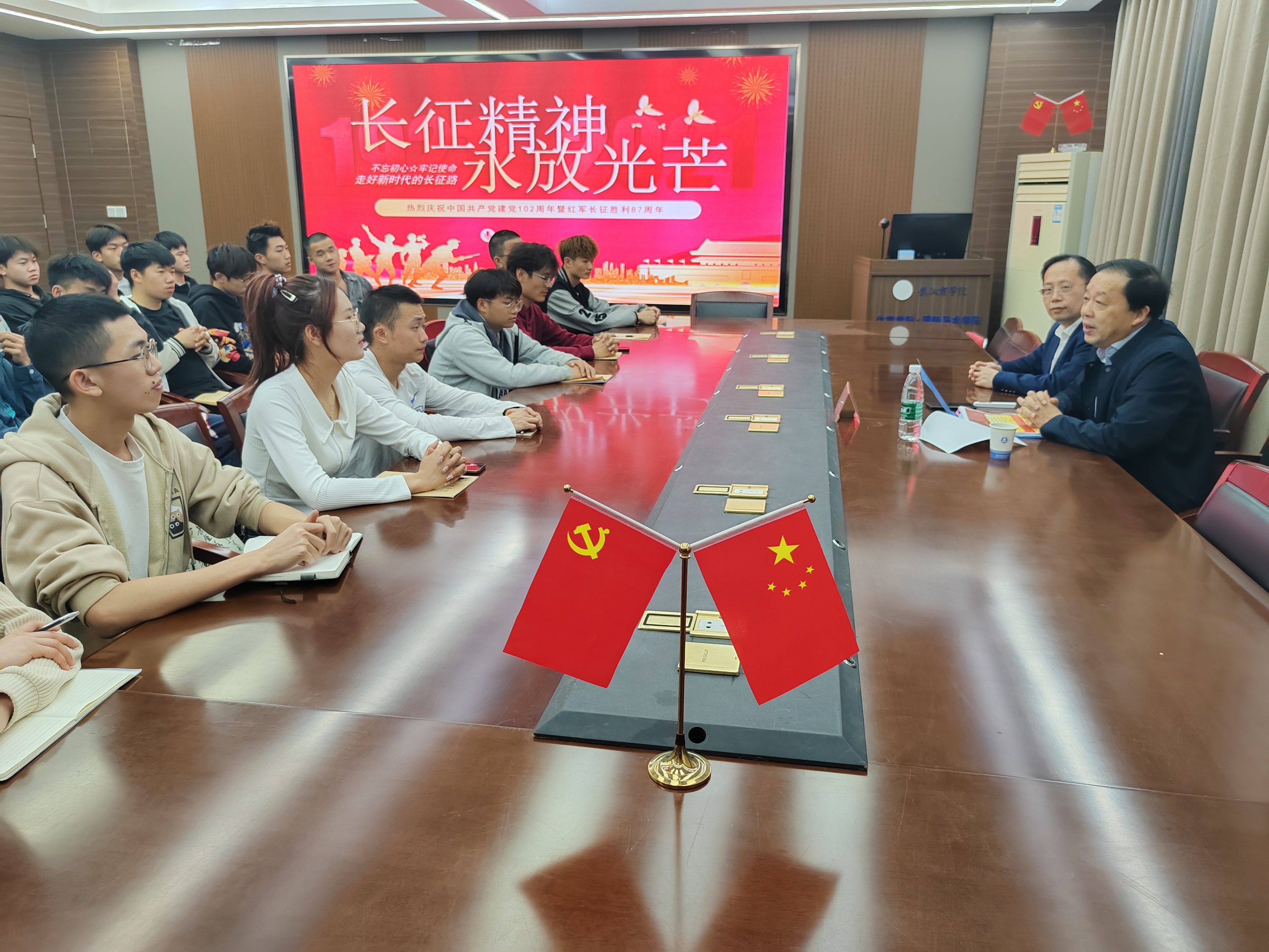 张石副校长以《七律·长征》作为开场白,把同学们的思绪拉入到那个战火纷飞、艰苦卓绝的年代,张石副校长从长征的历史回顾、长征的著名历史事件、长征精神的意义、五代领导人话长征、不忘初心走好新时代的长征路等五个方面对长征精神进行了讲解,系统回顾了中国共产党领导红军战胜千难万险,付出巨大牺牲,胜利完成震撼世界、彪炳史册的长征的奋斗历程,全面解读了红军长征胜利的伟大意义与时代价值。特别是陈树湘断肠明志、为苏维埃流尽最后一滴血的故事,令在场的学生感动。张石副校长最后鼓励在座的大学生,要坚定不移听党话、跟党走,深入学习习近平新时代中国特色社会主义思想,不断坚定红色信仰,自觉做到“两个维护”,不断夯实“四个自信”,用实际行动弘扬伟大的长征精神,做有理想、敢担当、能吃苦、肯奋斗的新时代好青年。