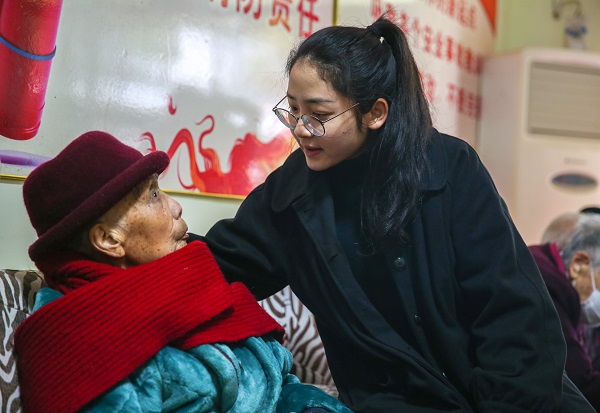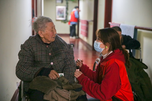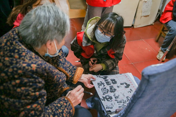 在现场,老人们与志愿者讲述着他们的人生。一位叫黄兰的老奶奶与志愿者分享着她的老伴周云:“他啊,是位画家。”黄奶奶以前在印刷厂工作过,所以她识得字,在志愿者们准备的宣纸上一遍又一遍写着“画家”这两个字。另外一位戴红帽子红围巾的奶奶以前还是一名红军,她给志愿者们讲述了他们那个年代的艰苦岁月,表示对现在的生活十分感恩。“但是我们不能忘记那段日子,要时刻铭记着啊。”红军奶奶拍了拍身边志愿者的手,郑重说道。