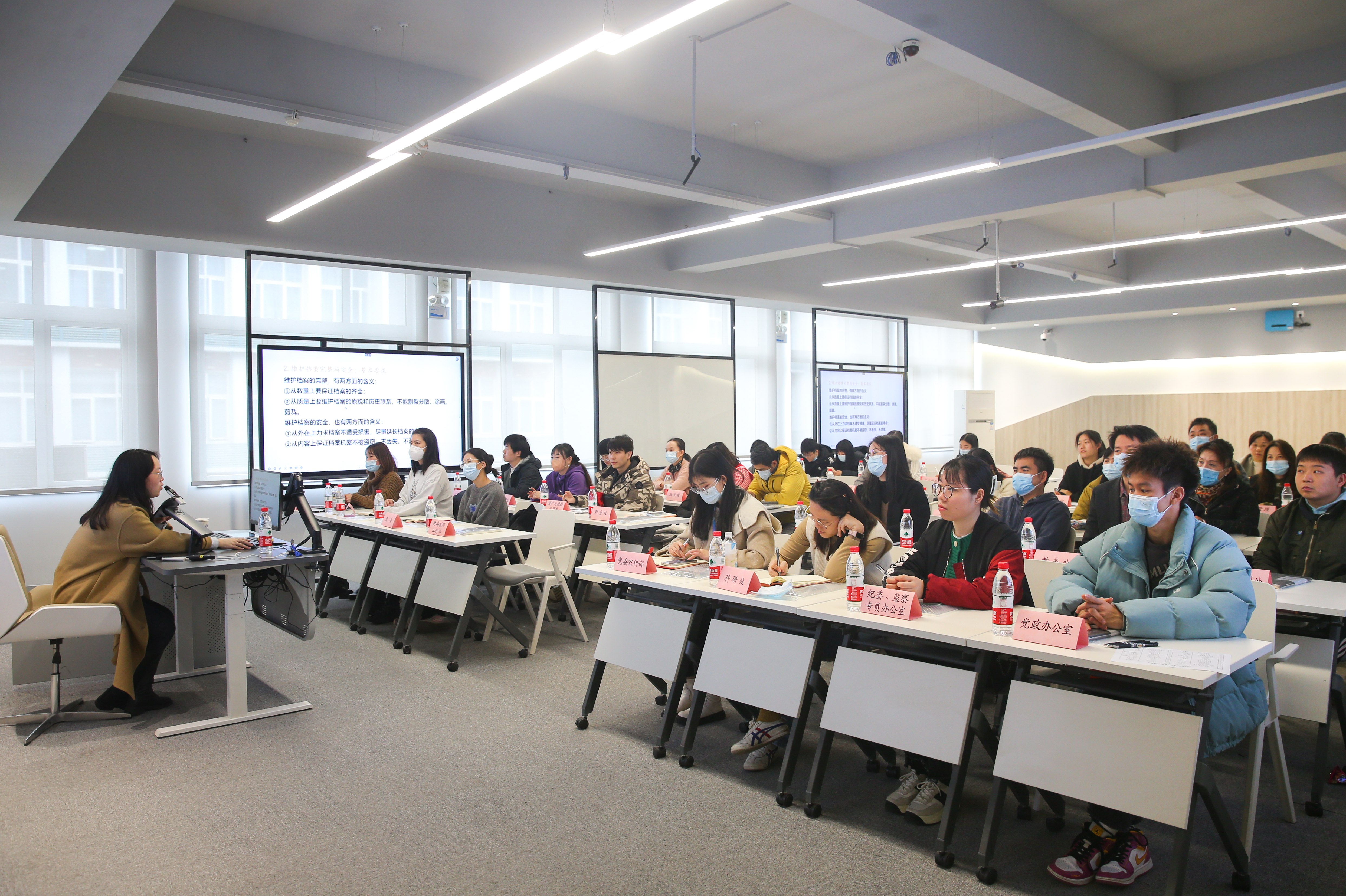 本次讲座主题为《日常档案管理工作须知》,讲座内容围绕档案与档案工作,档案法规与标准简释以及档案管理工作须知三个方面展开。王思敏为大家阐述档案概念及分类、档案工作体制、档案“三合一”制度执行、文书文件的预整理以及档案开放与利用公布的规定等内容,使参会人员对档案管理的重要性和方法有了更深刻的认识。同时重点讲解了新修订档案法新增章节,强调了档案肩负“为党管档、为国守史、为民服务”职责。参会人员认真听授,受益匪浅。