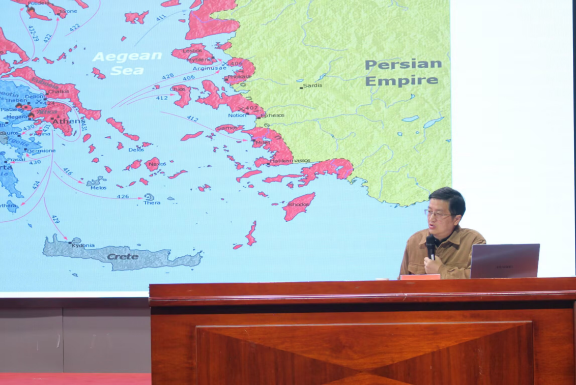 活动伊始,袁艺如同学点明了本次致远讲坛活动目的:从古典学的角度,为同学们展示史学方法,并与当下国际关系相联系,提供一个历史研究与现实关怀相联系的案例。随后,何元国教授先向大家详细讲解了“修昔底德陷阱”概念的由来,让同学们了解到这一概念是中外现代国家关系的研究者艾利森提出的。紧接着,何元国教授从“艾利森忽视了古典学者的研究成果——这个概念不符合修昔底德的原意”、“艾利森忽视了国际关系学者的研究成果——‘权力转换理论’才是其理论依据”两方面,对“修昔底德陷阱”这一概念立论反驳。此外,何元国教授还向大家介绍了吉尔平的“争霸战理论”。最后,何元国教授做出总结,升华主题,让同学们更好地理解了“修昔底德陷阱”。