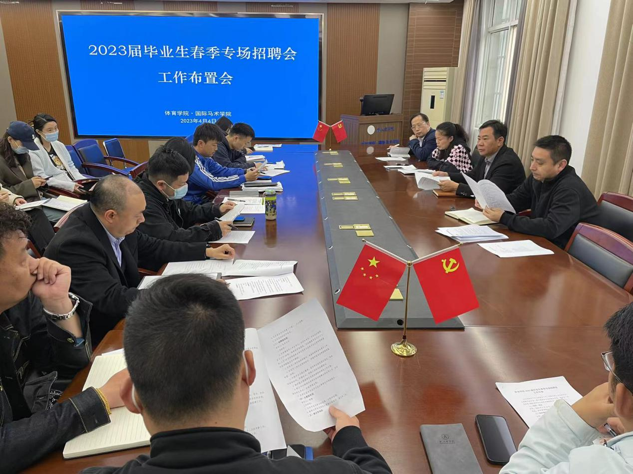 为更好地拓宽我院2023届毕业生就业渠道,提升人岗匹配精准度和实效性,推动实现更高质量更充分就业,4月4日,体育学院·国际马术学院召开2023届毕业生春季专场招聘会工作布置会,学院领导班子、系部负责人、就业联络员、毕业班辅导员参加,学院党委副书记余刚主持会议。