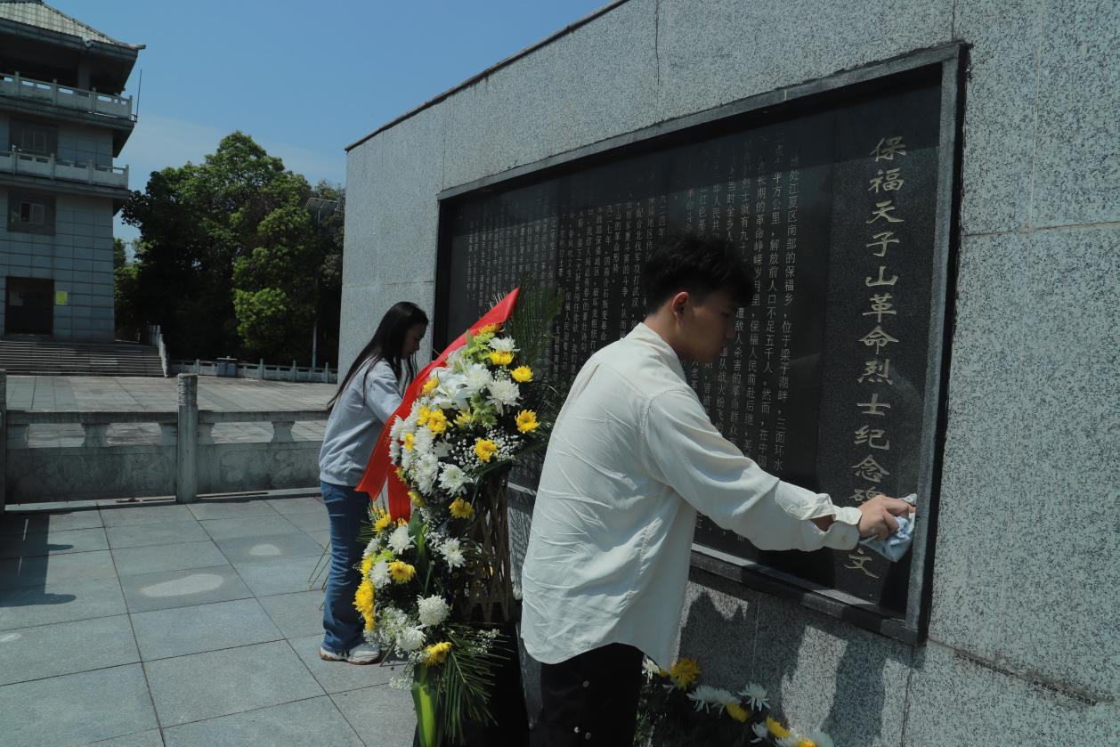 参观结束后,全体师生徒步走上天子山顶,瞻仰了革命烈士葛达墓、天子山革命烈士纪念碑,并列队默哀、献花、鞠躬,表达后辈对先烈们的无限敬仰和深切悼念。全体党员瞻仰烈士纪念碑后,手拿毛巾,俯身于烈士墓碑前,擦拭墓碑上的灰尘,清理了园内杂物、落叶等,深刻缅怀革命先烈。