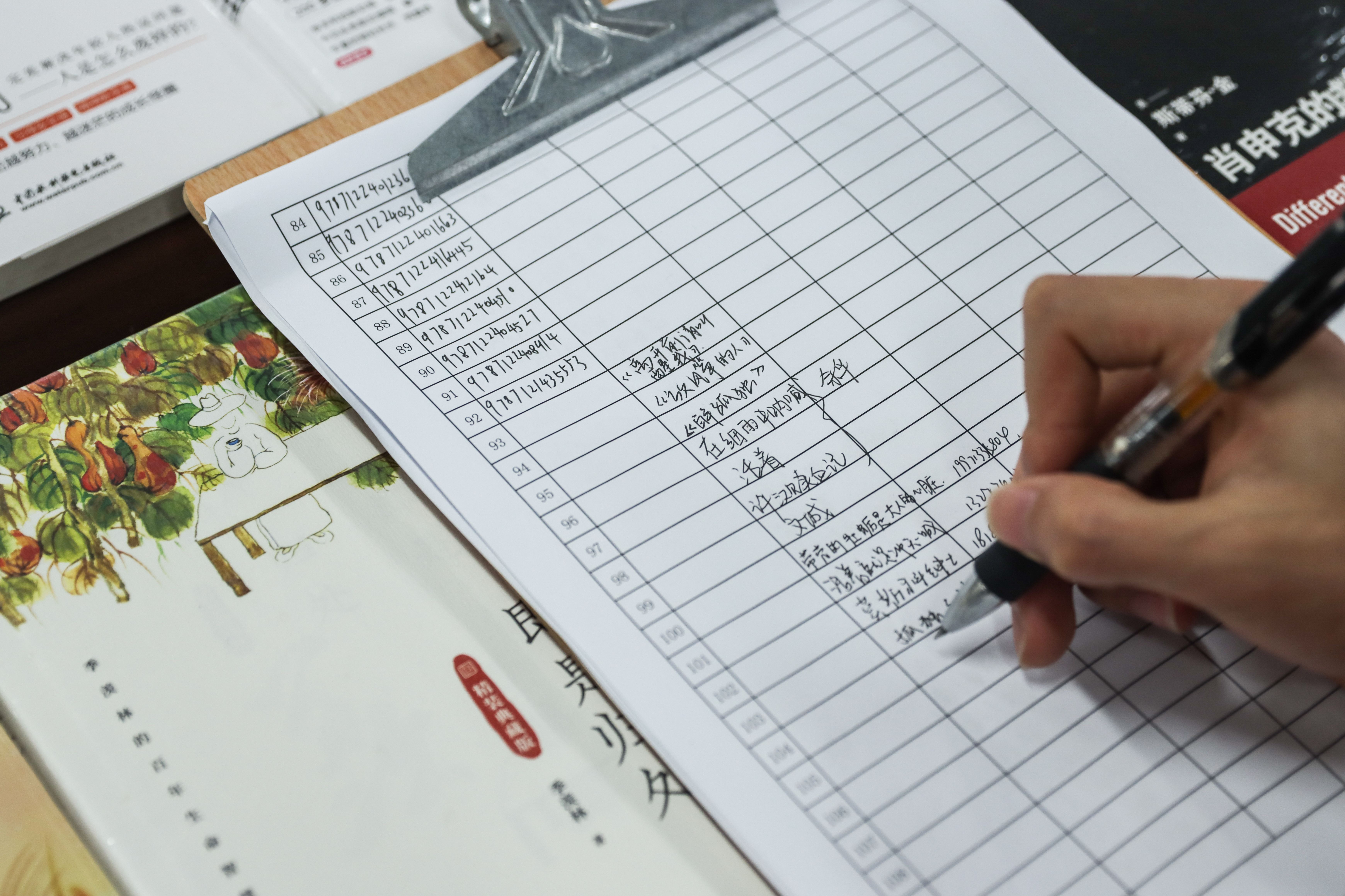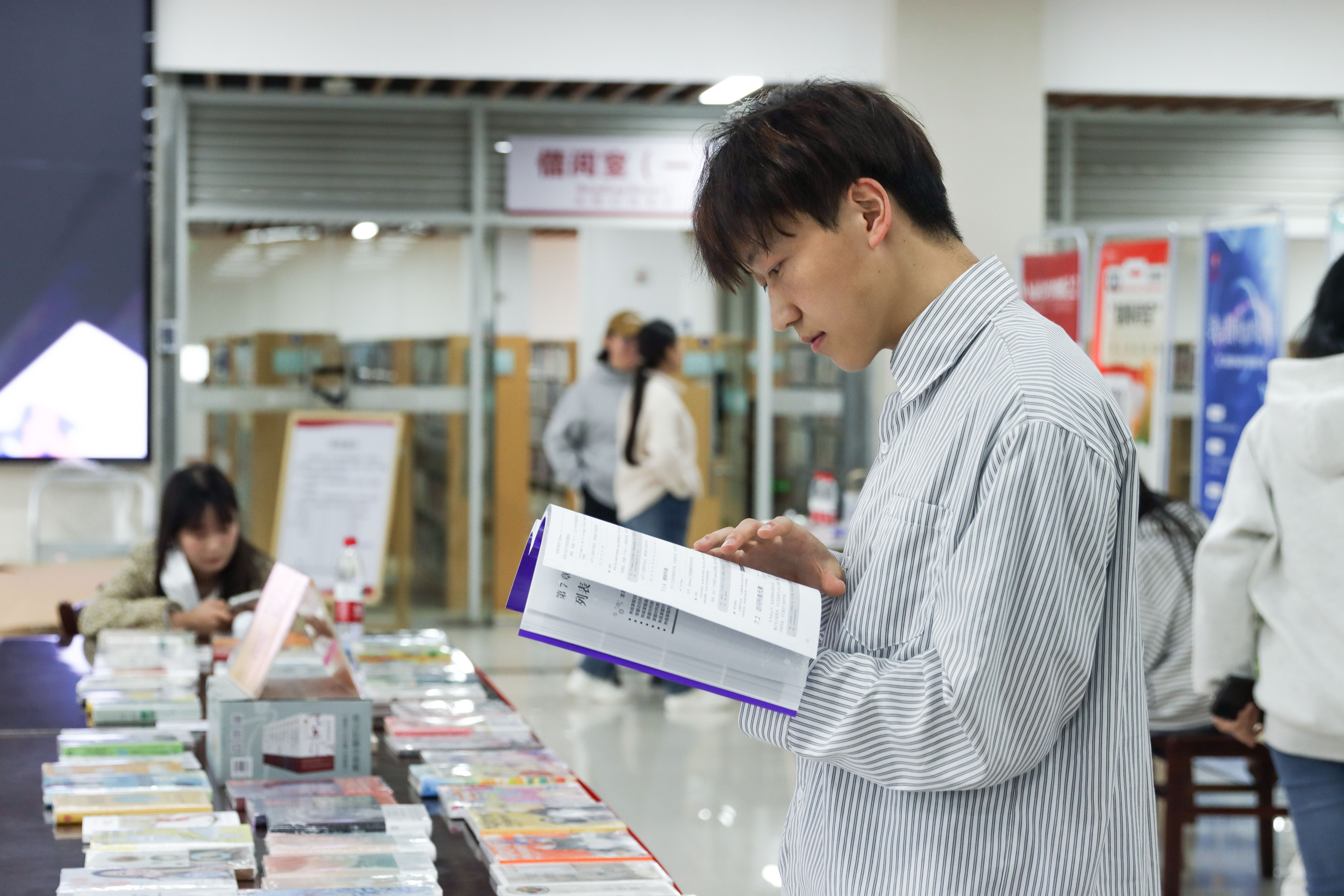 图书登记区域也围满了学生。从《卡门》到《预期思维》,从《在细雨中呐喊》到《狗语者》,又或者是《诗经》《纳兰词》……书籍种类多样,涉猎范围广阔。冒着雨过来的大二学生柳千千在现场惊喜又激动。“亲临现场才感受到了氛围的热闹,原来有这么多同学和我一样热爱书、热爱文字、热爱阅读。”审计专业的雷远双平时的爱好就是看各类书籍,他写下自己需要的几本书后又借了几本财会类书籍回宿舍。“基本上每来一次图书馆都会借两本书,已经成了习惯。”雷远双分享。