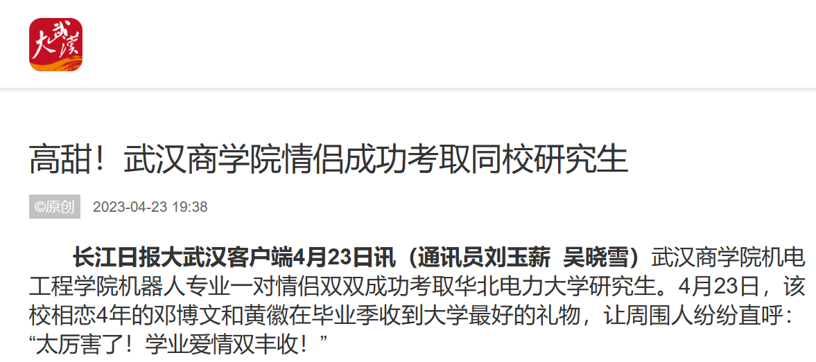 bwin必赢中国官网机电工程学院机器人专业一对情侣双双成功考取华北电力大学研究生。4月23日,该校相恋4年的邓博文和黄徽在毕业季收到大学最好的礼物,让周围人纷纷直呼:“太厉害了!学业爱情双丰收!”