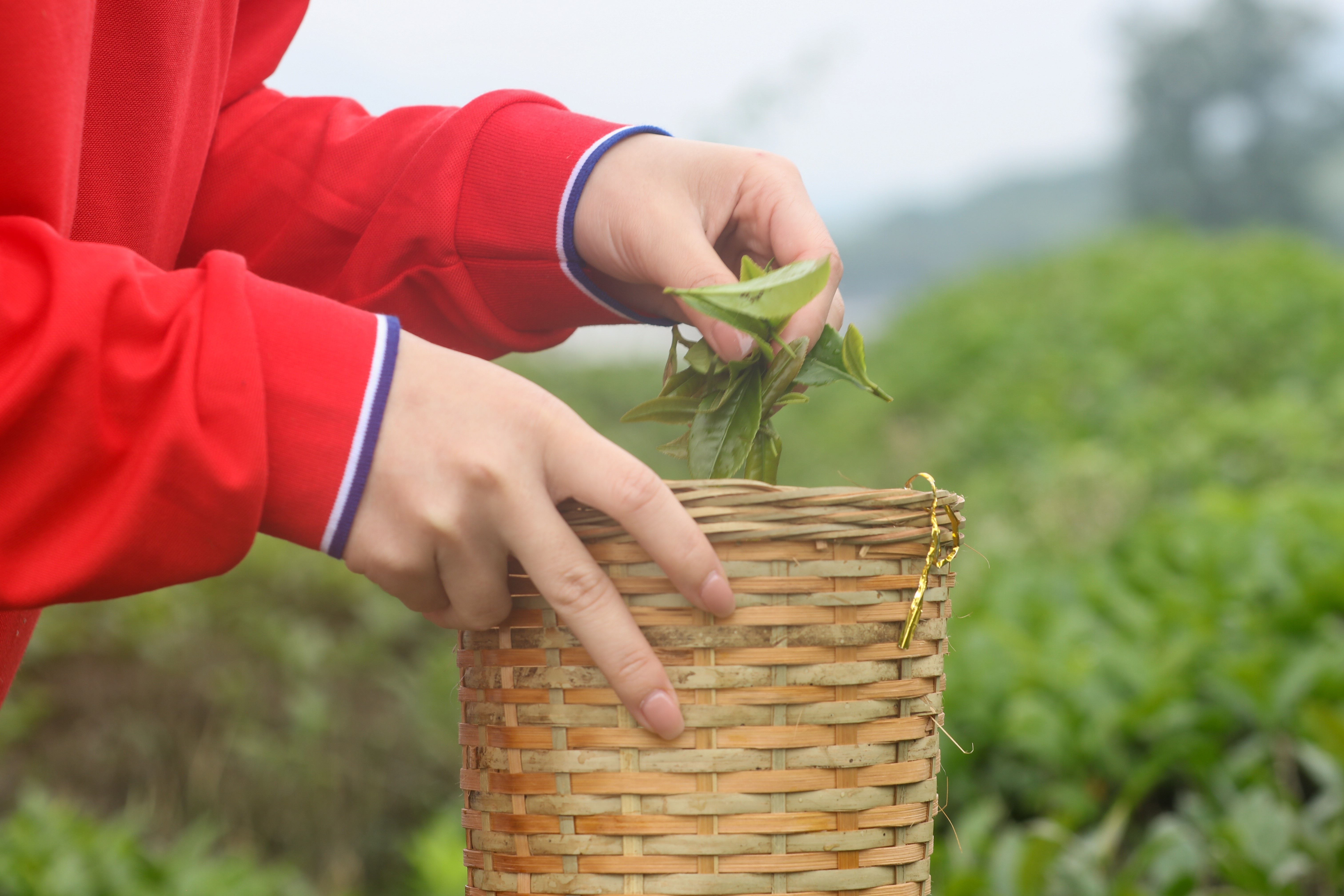 “传统的绿茶、红茶,选用的是一芽一叶或者一芽两叶的嫩茶,而青砖茶是用带梗的老叶来生产。”带队导游演示说。双手翻飞在茶枝间,轻摘慢放至蓝篓中,工商管理学院周语涵采摘茶叶又准又快,“我老家是十堰的,在家附近的茶园帮忙采摘过好几回茶叶,采摘很拿手!”周语涵分享说。不同于周语涵的熟练,大四学生陈首皓是第一次下茶园采摘:“从来没做过手工活儿,没想到采茶还有不少‘门道’,正好借这次机会可以好好学学。”不出一个小时,现场学生小茶篓里的“战利品”茶叶已经堆起小山,不少学生拿出手机拍照打卡,将采摘的茶叶图片分享给家人朋友,收获感满满。