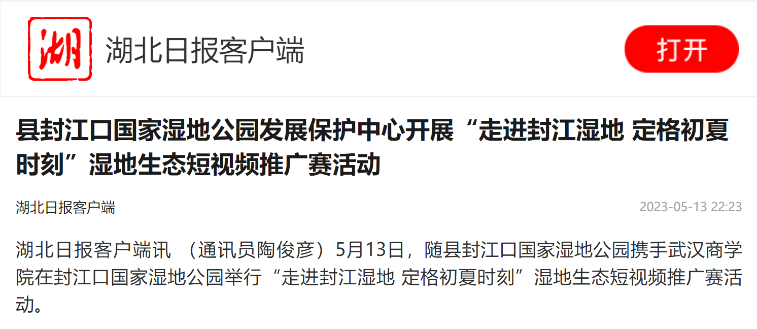 湖北日报客户端讯 (通讯员陶俊彦)5月13日,随县封江口国家湿地公园携手bwin必赢中国官网在封江口国家湿地公园举行“走进封江湿地 定格初夏时刻”湿地生态短视频推广赛活动。