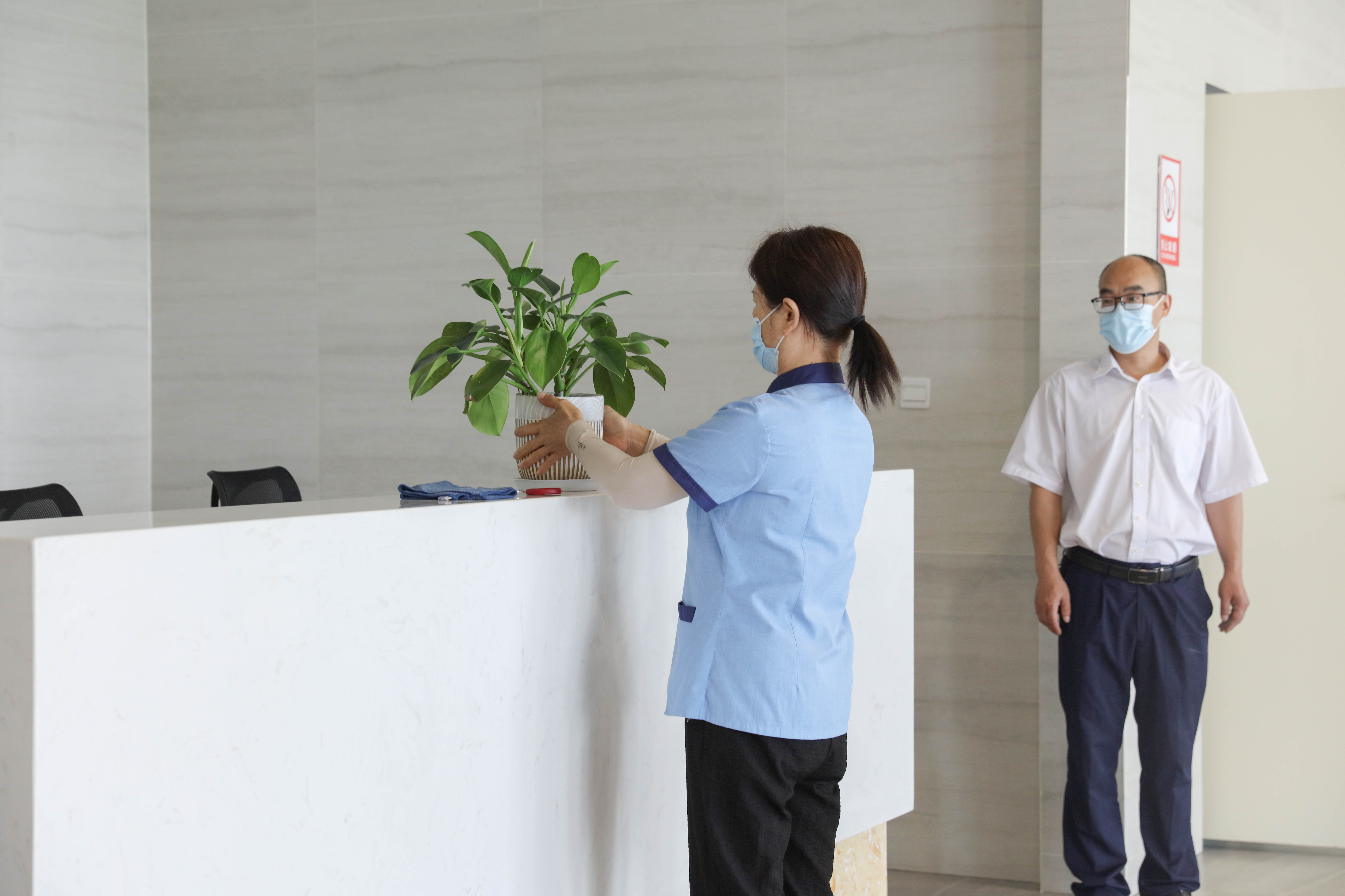 丽岛物业经理吴伟向在场人员讲解了卫生间保洁工具摆放标准、保洁玻璃刮洗、室内绿植清洁流程等注意事项,并由员工代表进行操作示范:把干燥毛巾铺垫在玻璃底端;涂水器安装在伸缩杆上将玻璃均匀涂抹,从上至下或从左至右刮去污水,将踢脚线擦拭干净,然后进行下一块玻璃清洁。在清洁绿植时,则应将枯黄的枝叶用剪刀剪掉,针对阔叶植物和细叶植物的特点采取不同的清洁办法,以达到干净美观的目的。在场员工代表认真聆听,悉心学习,反应热烈。