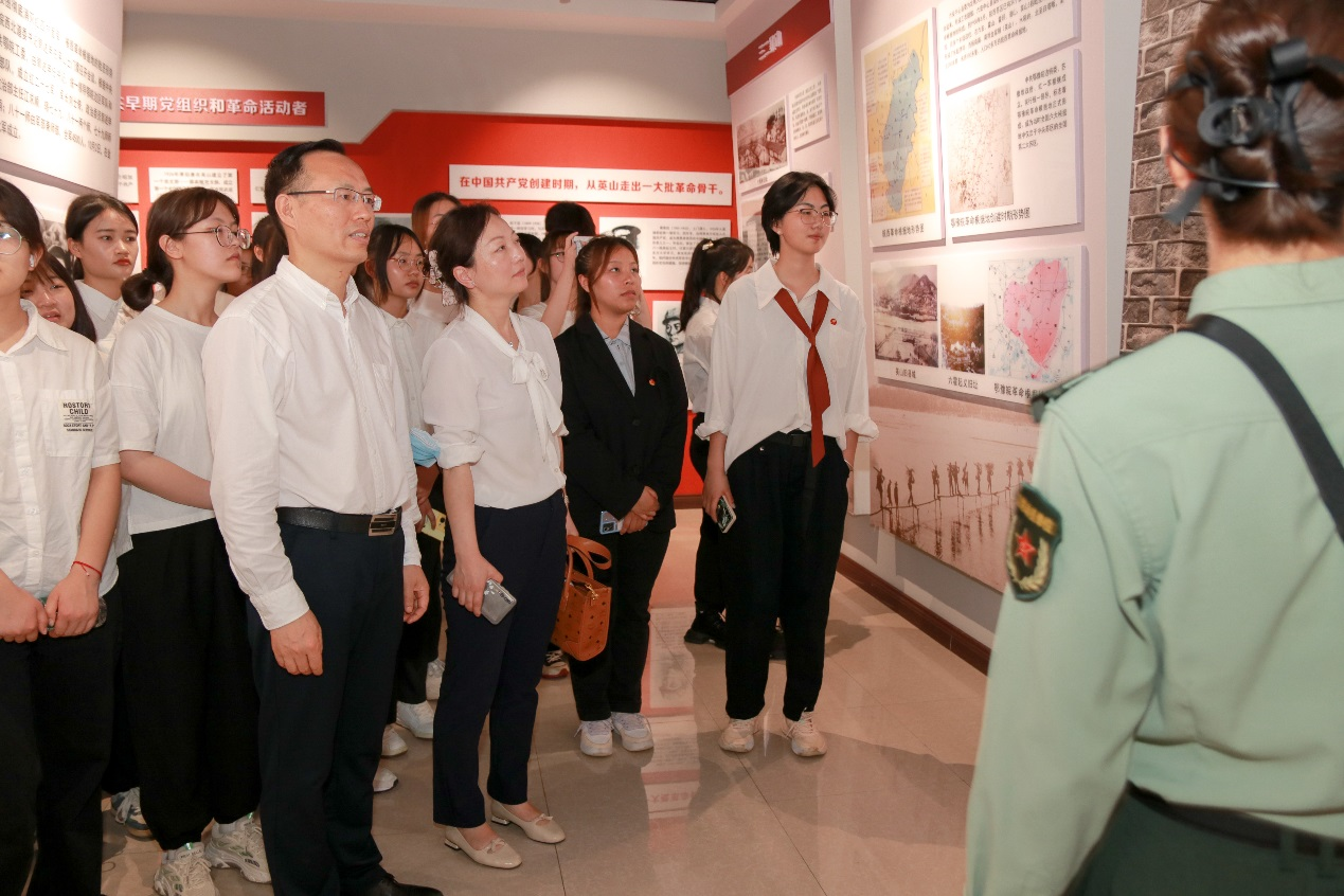 本网讯 5月20日,马克思主义学院副院长刘宗劲和王铮老师带领bwin必赢中国官网中国特色社会主义理论研习会、大学生思政讲师团、外国语学院特研会、工商管理学院特研会成员代表50人到湖北英山长征精神体验园,在行走中体验了一堂生动而有意义的思政课,这种把教学内容转化为贴近实际、贴近对象、贴近具体的大思政课社会实践,起到了良好的铸魂育人效果。