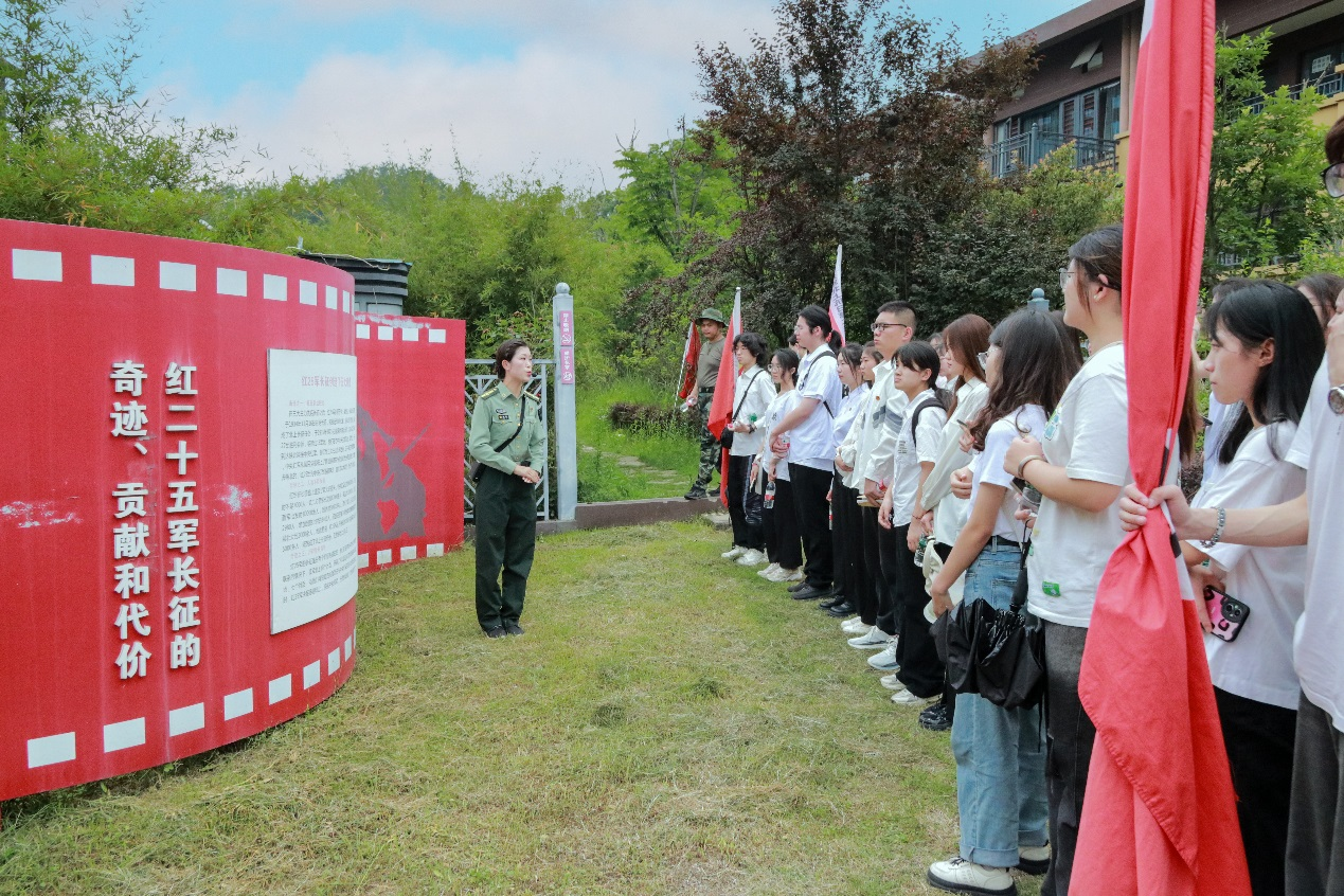 在英山长征精神体验园讲解员的带领下,全体师生在二十五军长征路上,沿途听红色经典,了解艰苦卓绝、迭挫强敌、英勇奋斗的二十五军党史和军史故事。前半段路程全体师生走崎岖山路,沉浸体验红军长征路上的艰辛,并在山路中模拟了一场围剿战,各队成员跟随领旗手进入“碉堡”,“碉堡”中有枪支模型以及吹进攻号的号角手,讲解员在现场放模拟硝烟及枪声,旗手高扬手中党旗,模拟穿越敌人封锁线,气氛激昂,极具沉浸感,围剿战再现了硝烟弥漫的革命岁月。后半段沿途经过将军路,通过讲解员的详细讲解,大家了解了“百将之师”的英雄人物故事。