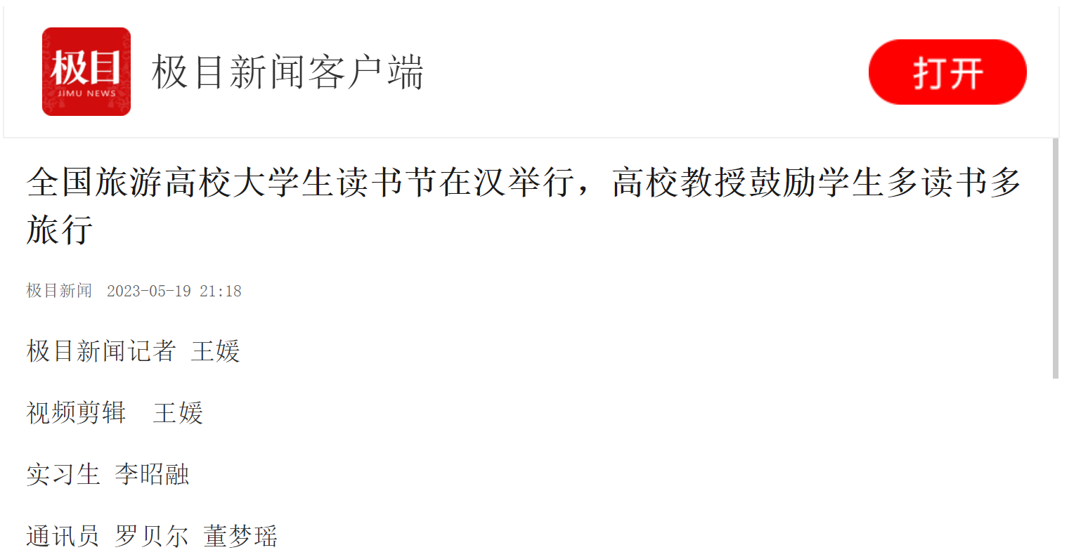 读书节发起人马勇教授倡议旅游大学生在本次读书节期间,旅游专业的大学生们能够充分利用这个难得的读书节平台,广泛阅读各类与旅游专业相关的书籍,拓宽自己的知识面,提升同学们的综合素质和实践能力。同时,也要鼓励同学们多出门旅行,走遍我们伟大祖国的大好河山,感受中华大地不同的地域文化和自然风光。