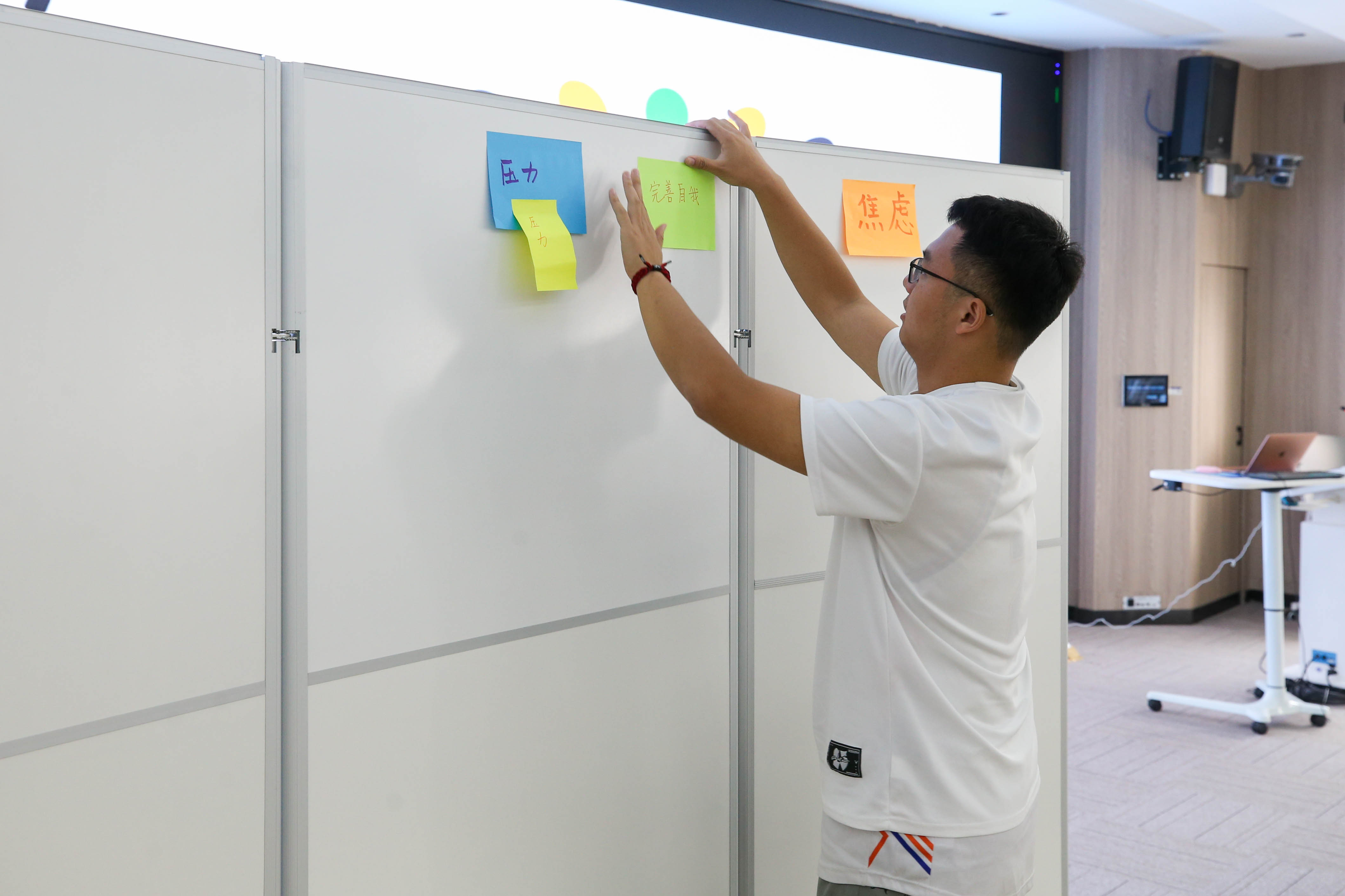 团辅教室分为展示区、分享区和活动区。根据团辅前挑选的表情徽章,拥有不同表情徽章的同学组成5到6人小组,一共组成了5个小组。