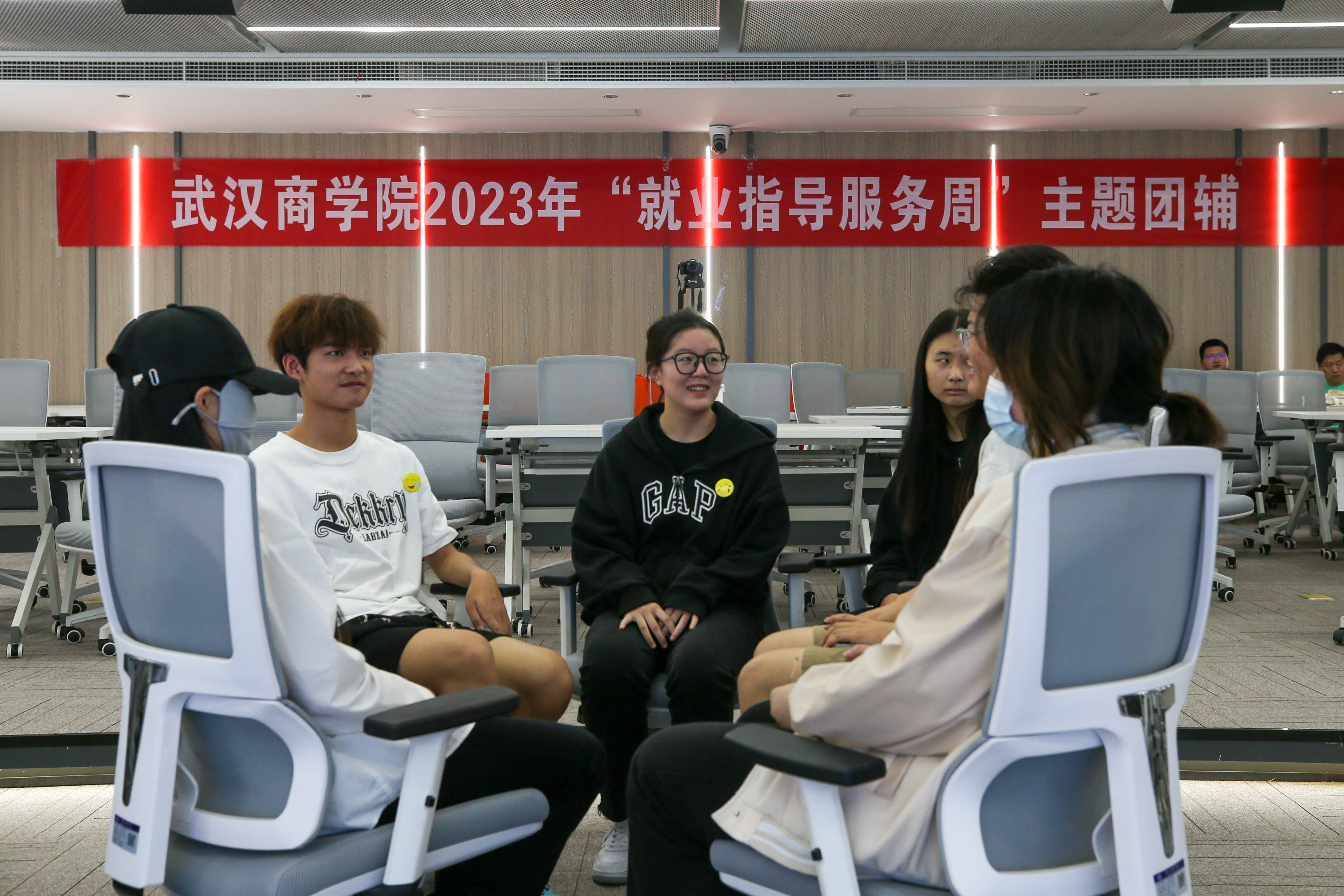 在小组入座活动区,首先进行的是“头脑风暴”活动。活动遵从三原则:“依序而来”、“不否定、不解释、不批判”、以及“穷尽”。同学们在白纸上依序写下有关就业心理的词语,有“压力”、“焦虑”、“逃避”,也有“期待”、“自信”和“勇敢”。其中,小组同频最高的词语是“压力”。对于“自信”这个词语,22级经济统计学1班的张士碧说:“只要有志向的人就会有事业,只要有本事的人就会有舞台,我相信有正确的择业观和就业观,我将会有一个不错的未来!”