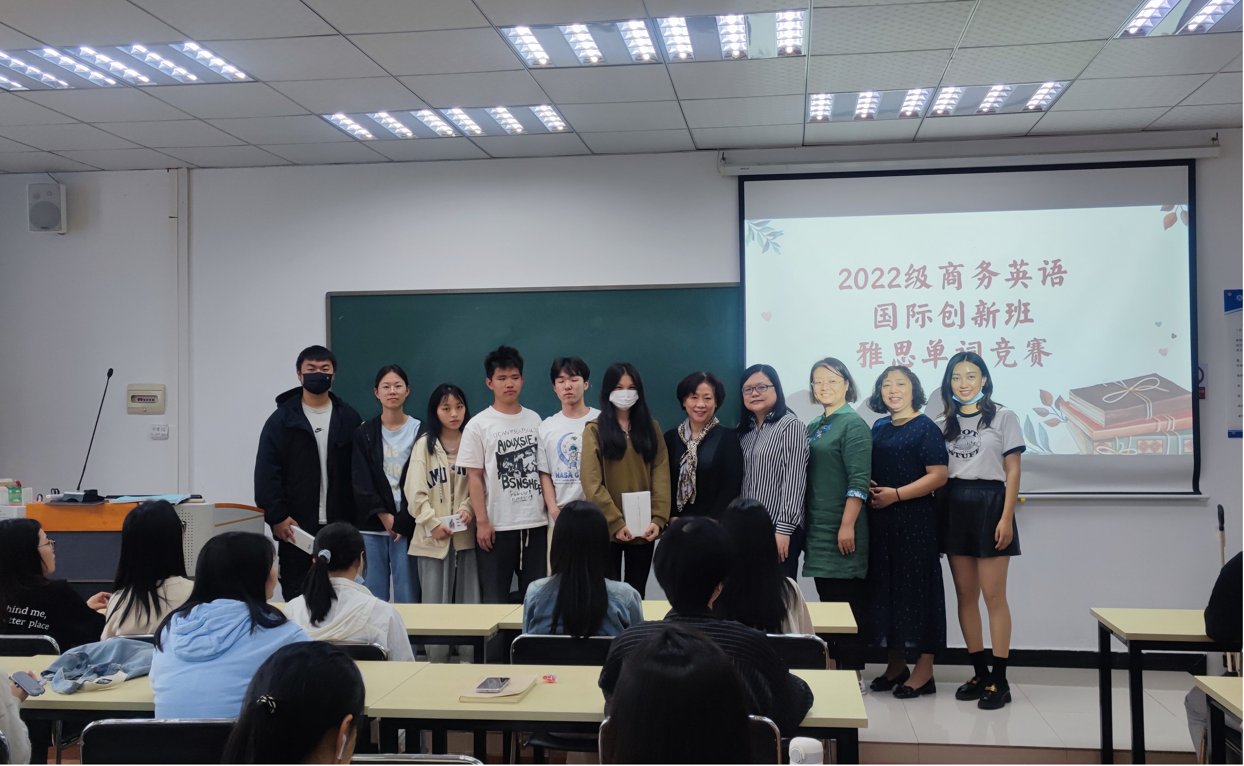 经过激烈的比拼,何灵依同学获得一等奖,李旺旺、娄芸赫同学获得二等奖,段梦柔、陈矜曈、程思悦同学获得三等奖。学院副院长忻竞,党支部书记周晓洁,商务英语教研室主任杨雪老师为获奖学生颁发了奖品。辅导员钟敏老师贴心地为每一位参与比赛的同学都准备了精致的奖品班主任。班主任沈忻老师鼓励同学们加强学习积极性,不断提高学习能力。