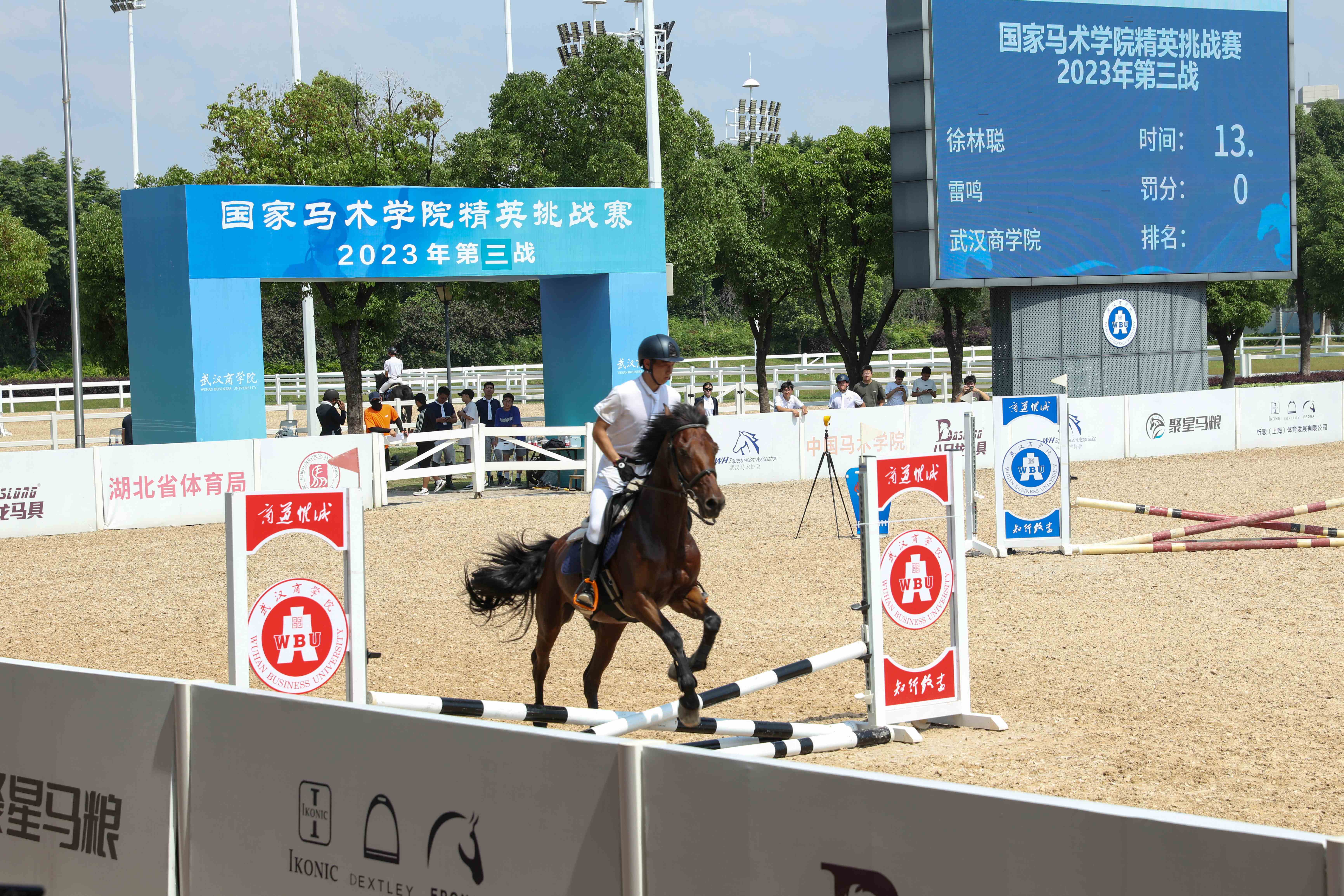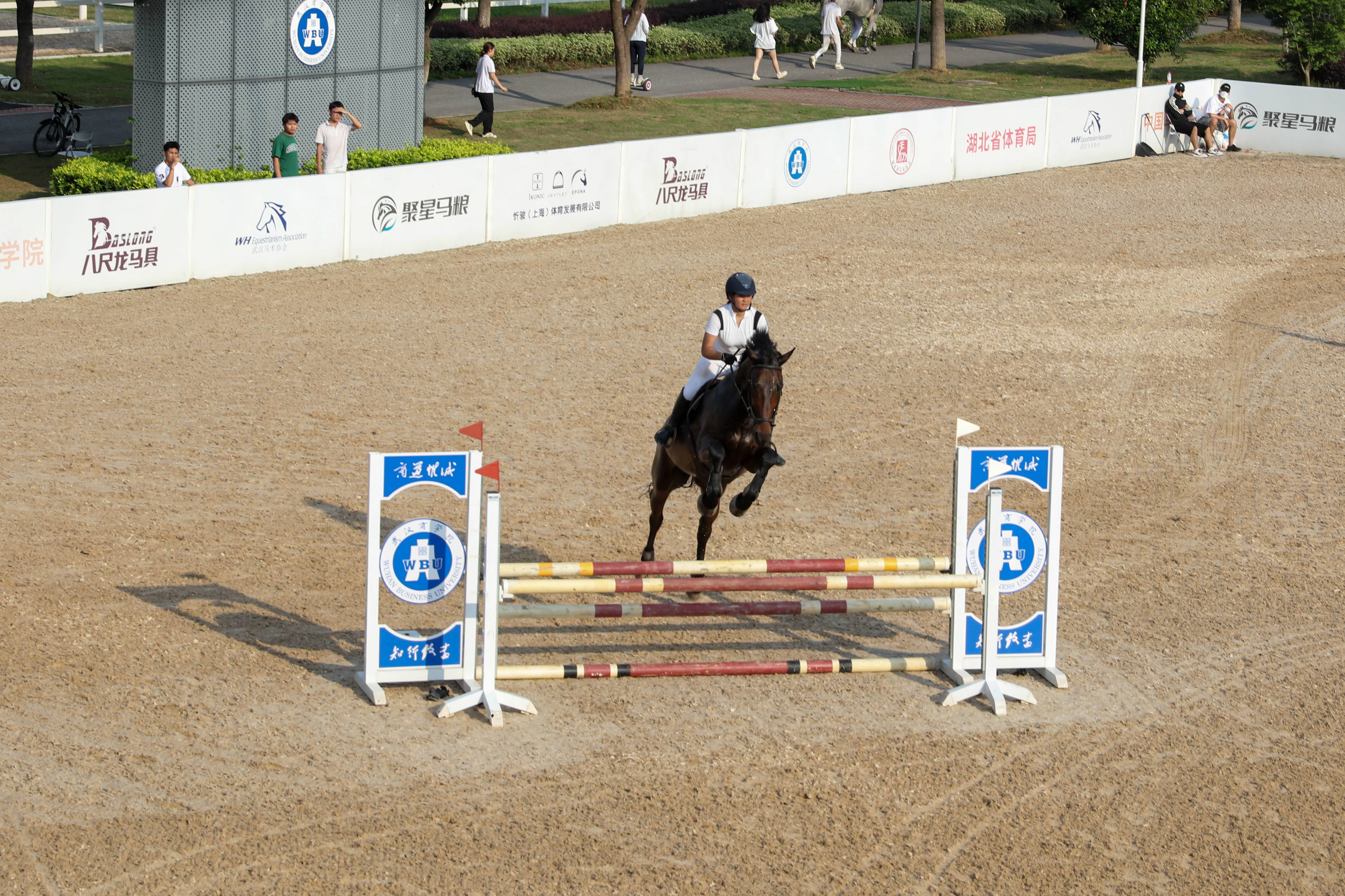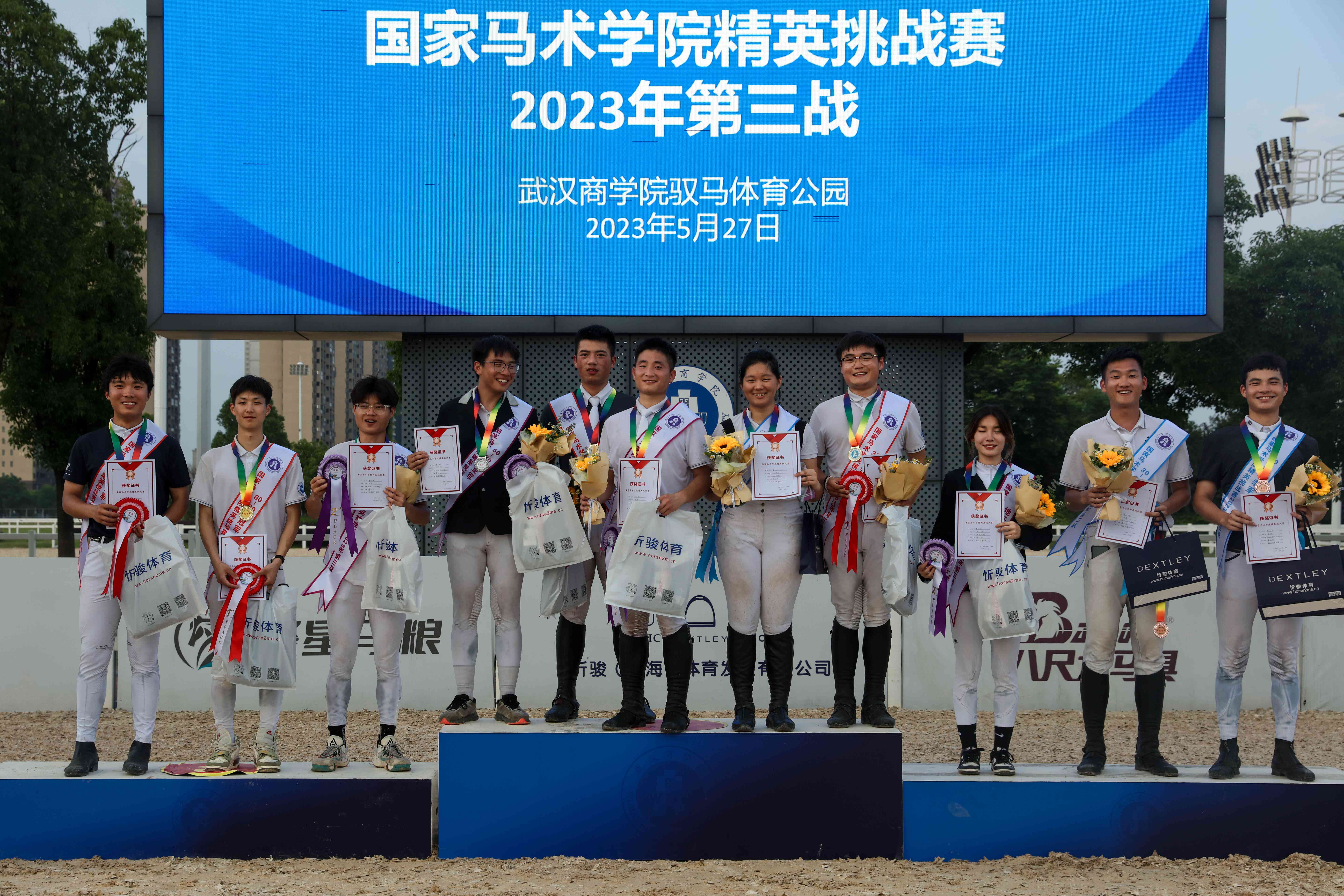 经过激烈比拼,赵文天获得本次比赛地杆赛冠军,30cm-50cm级别冠军由肖俊博获得,60-80cm级别由罗阳获得,90-100cm级别冠军由郑家凯获得。湖北省马术协会秘书长赵继安、体育学院·国际马术学院院长李要南、副院长马宏俊、马术运动与管理系副主任张双为获奖选手颁奖。