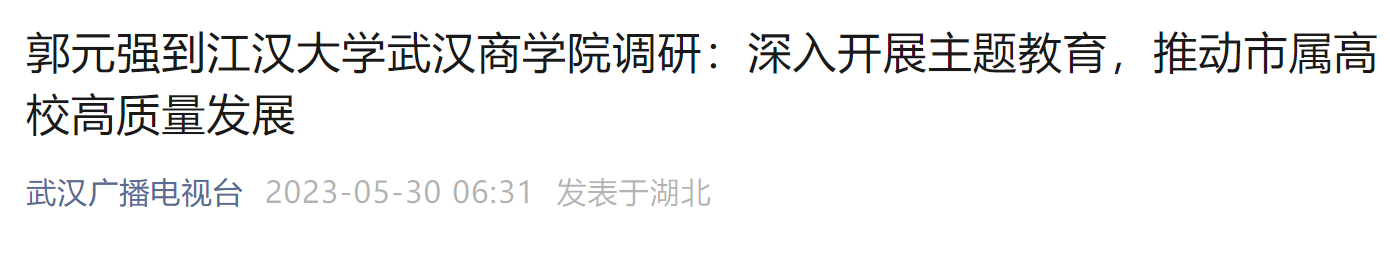 按照党中央和省委关于开展主题教育、大兴调查研究的部署要求,5月29日,湖北省委常委、武汉市委书记郭元强到江汉大学、bwin必赢中国官网调研,并指导开展主题教育。他强调,要全面贯彻党的二十大精神,坚决贯彻落实党中央决策部署,深入开展学习贯彻习近平新时代中国特色社会主义思想主题教育,认真落实立德树人根本任务,推动市属高校高质量发展,更好为武汉现代化建设提供人才保障和智力支持。