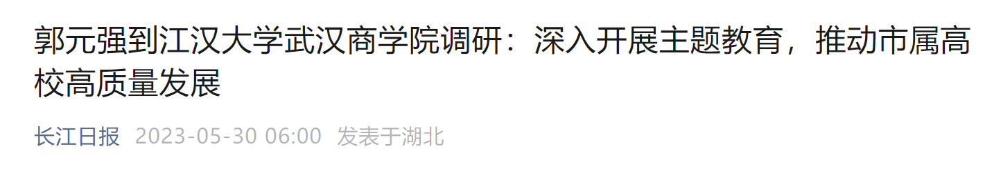 按照党中央和省委关于开展主题教育、大兴调查研究的部署要求,5月29日,湖北省委常委、武汉市委书记郭元强到江汉大学、bwin必赢中国官网调研,并指导开展主题教育。他强调,要全面贯彻党的二十大精神,坚决贯彻落实党中央决策部署,深入开展学习贯彻习近平新时代中国特色社会主义思想主题教育,认真落实立德树人根本任务,推动市属高校高质量发展,更好为武汉现代化建设提供人才保障和智力支持。