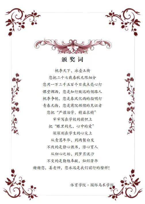 “作为教研室主任的您,在工作中对我指导,在教学和科研上对我教导,在生活中对我关心和帮助,还有那严厉并慈爱的语气,让我终生难忘......”公共体育教学部教师周柯深情地说。光阴荏苒,弦歌不辍。5月30日下午,体育学院·国际马术学院用最真挚的情谊为即将退休的姜明教授举行了一场以“岁月如歌,感恩有你”为主题的荣休仪式,学院领导班子、各系部正副主任以及公共体育教学部教师参加了仪式。