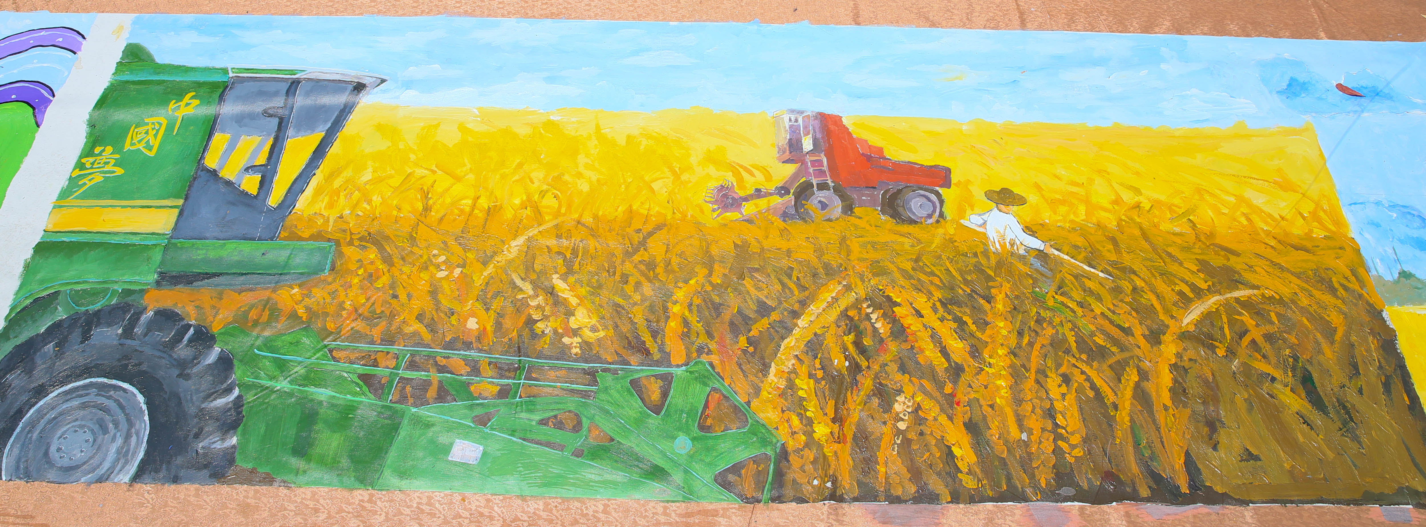 金黄色的田野上,农民伯伯正在耐心地收割着自己的劳动成果。“一把把金黄色的稻穗代表着的是劳动人民的希望和梦想,正是这样一个个劳动人民的梦想汇聚成了我们今天的中国梦。”作品的创作者、学生刘铭宇这样介绍自己的创作灵感。在他的画作之中,用于汇集这些代表着梦想的稻谷是一辆名为“中国梦”的收穗机。与他一同创作这幅长约2.8米的画作的是同班同学孙俊杰,他们认为粮食是我国的根基,民生的核心,而在广袤土地上耕作的农民是我国广大劳动者代表。