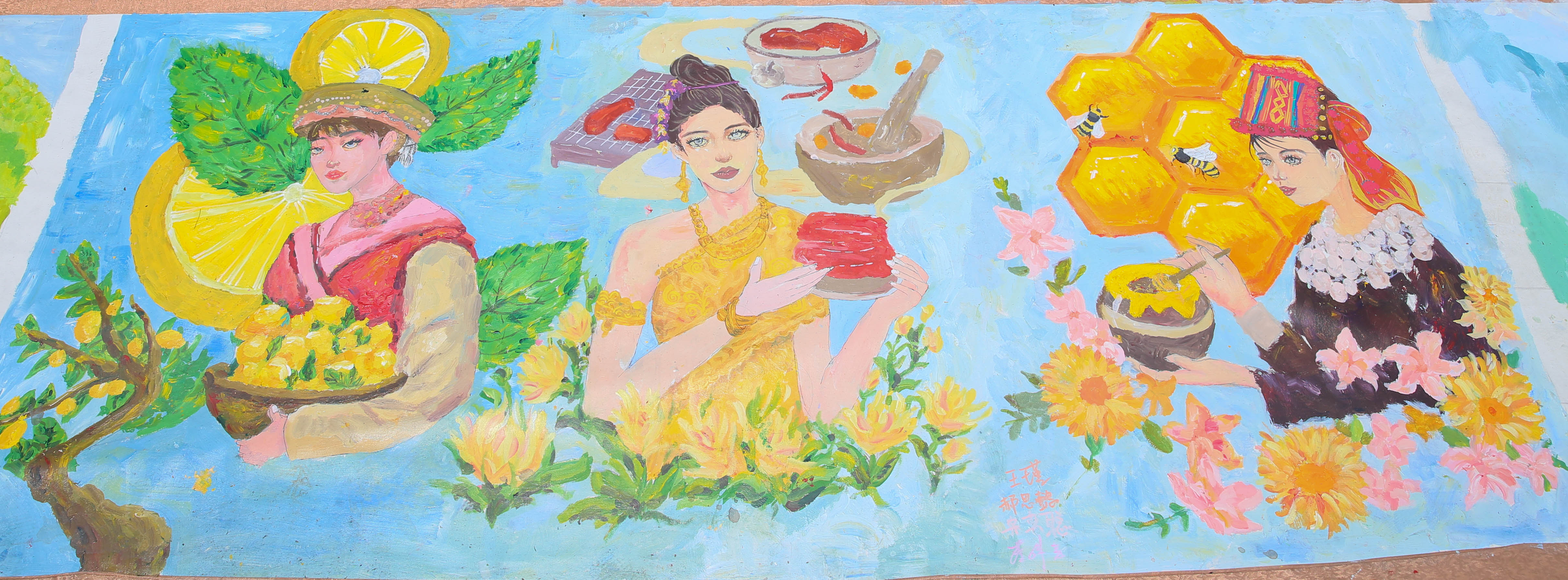 “不同民族的人民,都带有本民族特性的劳动方式,我们想用不同民族的劳动成果描绘我们心中劳动人民的身影。”学生王瑾正在热情地跟同学们介绍着作品,为了准备这幅画作,她和学院指导老师们一起忙碌了多日,“中间烤肉的是傣族,左边收获柠檬的是景颇族,右边正在制作蜂蜜的是白族。”一次次俯仰作画的辛苦并没有打消她心中对劳动的憧憬,此刻,她也成为大家眼中最美的劳动者。