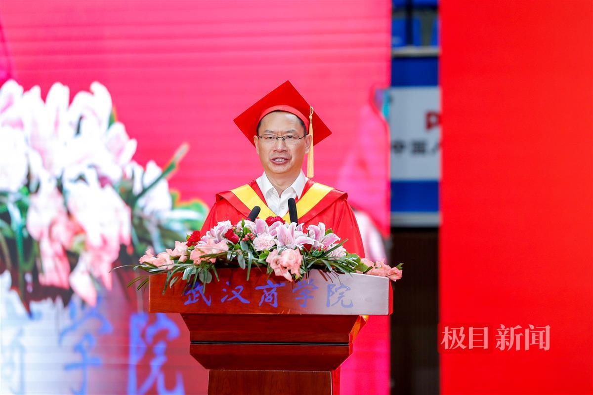作为学生代表上台发言的刘厚铧说:“学校给予了我们很大支持,在思想上给予我们引领,老师们都特别照顾我们的身心健康,我们有什么问题第一时间就能得到解决,辛苦了我们的辅导员,我们进来还是鲍哥,离开的时候已经是老鲍了。”他表示自己能作为学生代表发言十分幸运,今年学校有许多优秀的毕业生,“我从小镇来到武汉,第一次在江汉路见到了什么是车水马龙,也第一次看见那么多高楼大厦,在这里的四年,东风大道816号成为我人生当中不可磨灭的印记,能够在台上分享自己在校时期的感悟我十分开心,希望学弟学妹们以梦为马,不负韶华。”