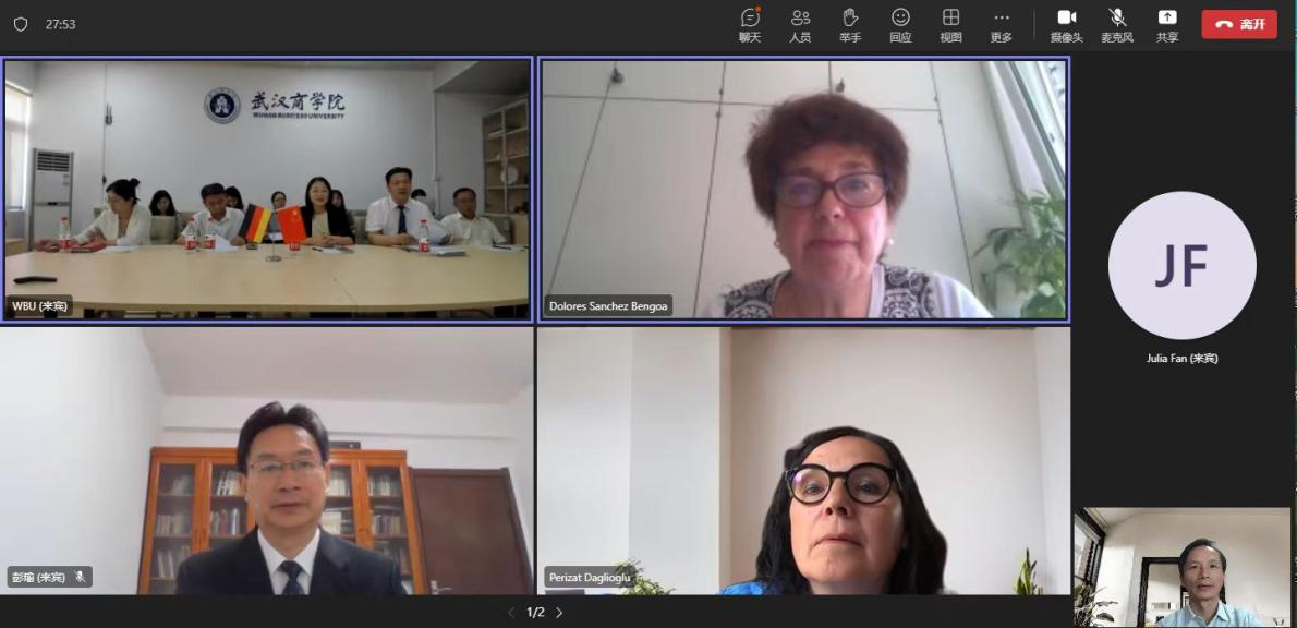 本网讯 7月10日,北京时间下午15:00,我校与德国经济管理应用技术大学通过Microsoft Teams会议平台,线上举办友好交流活动暨合作签约仪式。彭瑜校长、刘萌副校长、国际交流与合作处及经济学院相关领导和教师代表、德国经济管理应用技术大学Daglioglu校长、Sanchez-Bengoa副校长及Cofrin教授参加活动。
