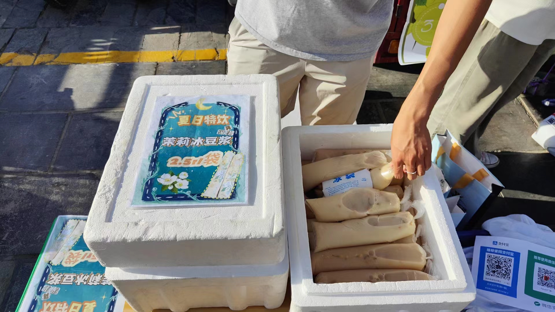 利用最近热门的长条袋装豆浆方式打包,倒入400ML左右调好甜度和冰度的茉莉冰豆浆,最后用冰袋包裹,全部装入保温箱,傅鸿博的准备阶段才算完成。白天准备食材、制作饮品,下午准时出摊,刚开始试营业阶段时,他的生意并不好,一直处于“负债”阶段。“每个人喜好的甜度不同,豆浆冰了之后又会比热的味道淡一些。”傅鸿博总结说,“出摊时间不对,天气太热外面人流量少,饮品还容易化,反而失了口感。”经过改进,傅鸿博的豆浆摊改成每晚6点出摊,不仅符合下班放学时间,晚饭后出门散步逛街的居民也会想要试试这款从没喝过的茉莉冰豆浆。试营业期过后,随着暑假期到来,傅鸿博的茉莉冰豆浆小摊一下子火起来,五点半就已经有居民在摊位前排队等待。