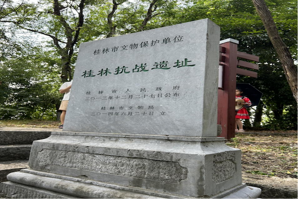 实践队第二站来到桂林抗战遗址。防空炮兵阵地、战壕、碉堡、掩体、司令部等军事工程彼此相连,让实践队员感受到抗日战争时期的桂林保卫战军民信念合一的民族精神。1944年10月28日,日军十几万人马大举进攻桂林,桂林保卫战由此开始。虽然守军与日军的兵力悬殊巨大,但是依托桂林山地的有利地形,顽强地阻击日军的进攻,并多次展开白刃战甚至将身上绑上手榴弹或者炸药用自己的身体炸毁日军的坦克和登陆艇,“战争是残酷的,但是中华民族永不屈服,即使在这样艰苦的岁月中,我们也毫不动摇的坚持民族品格,这种精神我们要代代相传,这样的英雄事迹更要永远铭记”实践队范勇说道。