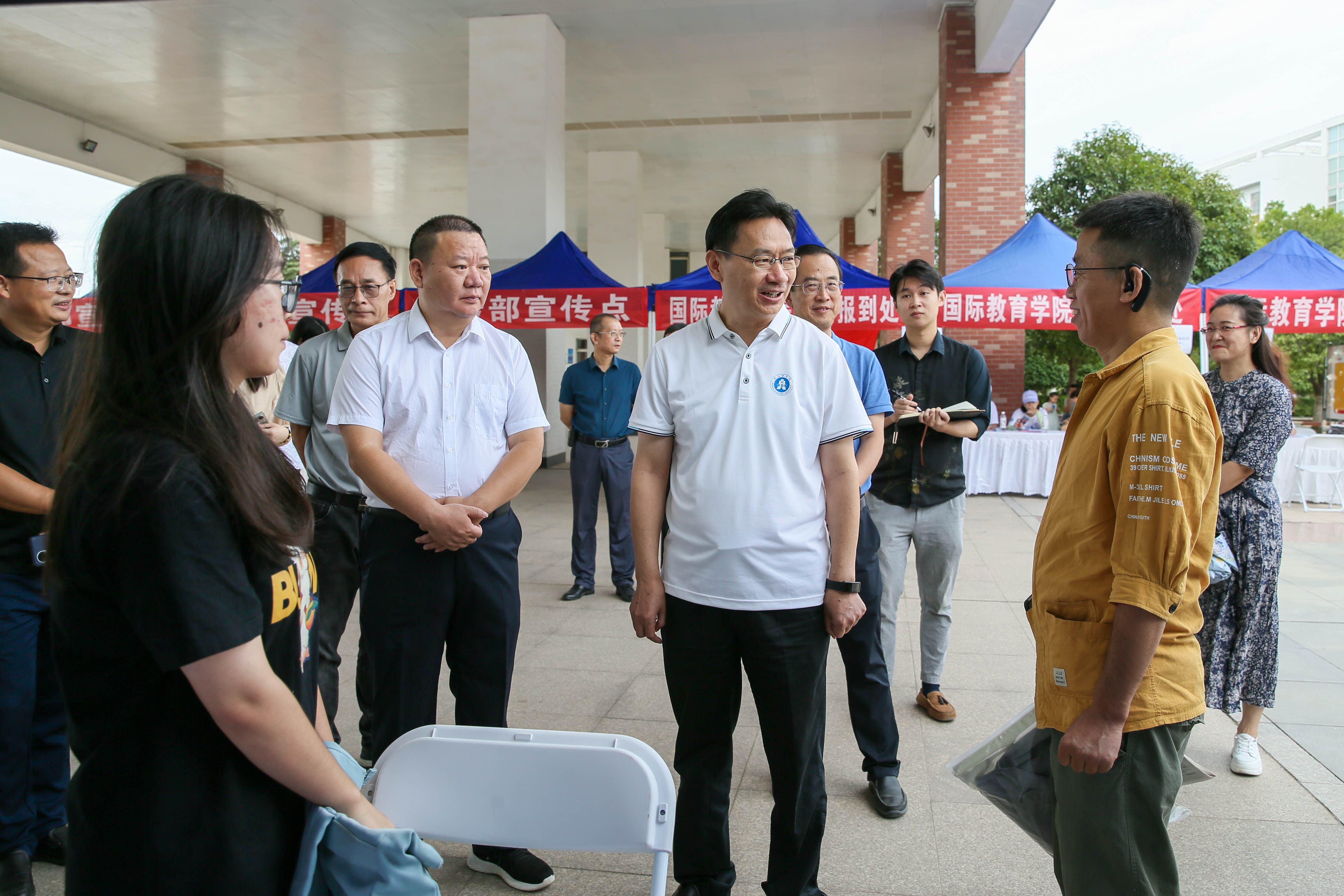 校长彭瑜及在校校领导来到各学院迎新点,迎接新生及家长,看望慰问工作人员和学生志愿者,学校领导走访每个院系的迎新报道点,了解今年招生生源情况,询问实时报到数据,要求现场工作人员为新生提供优质服务,及时解决新生的困难。“和爸妈从哪里过来?”“对大学生活准备好了吗?”“和宿舍同学见过面了吗,感觉怎么样?”“小伙子在学校学习之余也要锻炼身体哈”彭瑜与新生们亲切交谈,给出建议和指导,勉励大家争做时代发展的先锋,始终以饱满的热情和昂扬的斗志投入到学习中去,在探索未知世界中锤炼实践能力。