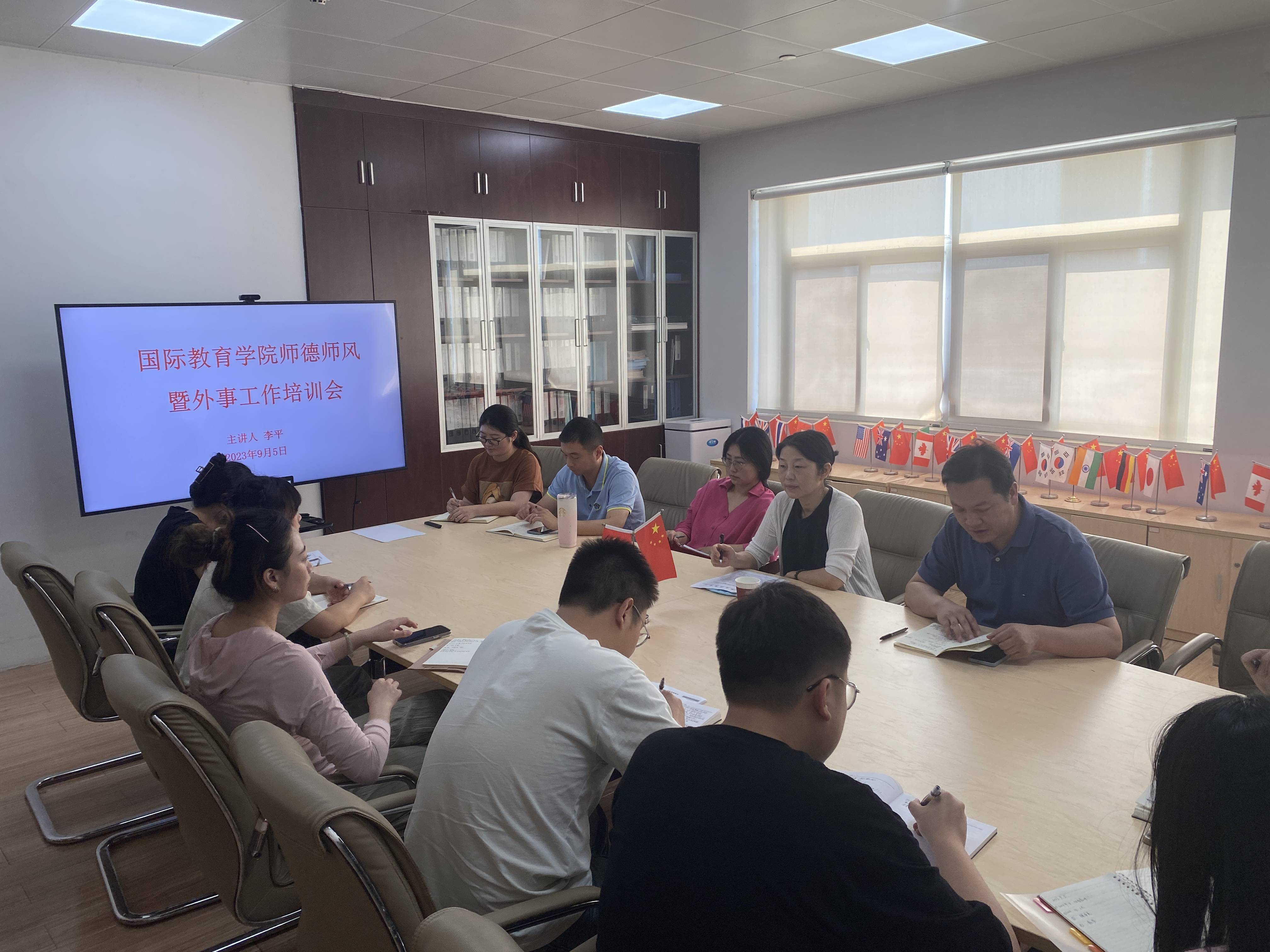 9月5日上午,在第39个教师节来临之际,国际教育学院在行政楼319会议室开展师德师风暨外事工作培训会。刘萌副校长、学院全体教师参加活动,李平同志主持会议。