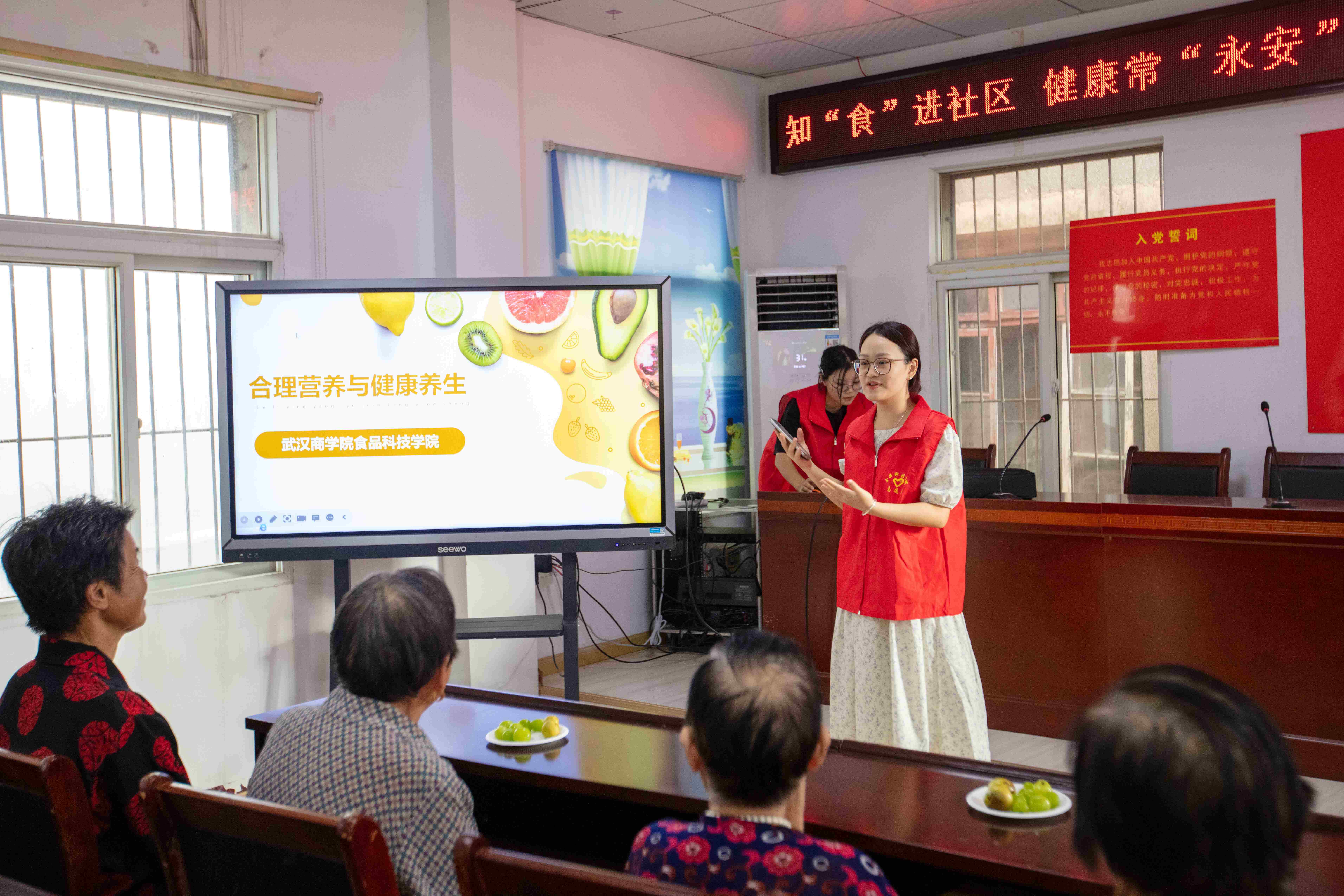 来自22烹饪工艺与营养二班的陈子怡结合一周食谱,分享适合中老年人的三餐营养搭配,给出老人们具体的建议和食谱参考。永安社区居民殷汉红在听完同学们的知识分享后,十分感谢志愿者们:“老年人吃的健康,身体才会更加健康。能跟年轻人们一起学习这些知识,感觉自己也年轻了不少。”