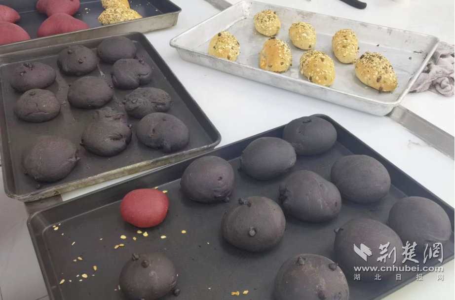 三角枫叶形状的红色奶酪包、橄榄形的表面附着葡萄干、熟核桃仁等多种坚果的彩色杂粮包,由巧克力“画龙点睛”、憨态可掬的黑眼豆豆包……最初的面团在经过层层工艺制作后,成为形状各异、色香味俱全的软欧包。柔软的面包组织,卷裹上足足的馅料,葡萄干的甜、核桃的香、面的浓郁,口感丰富,回味十足。