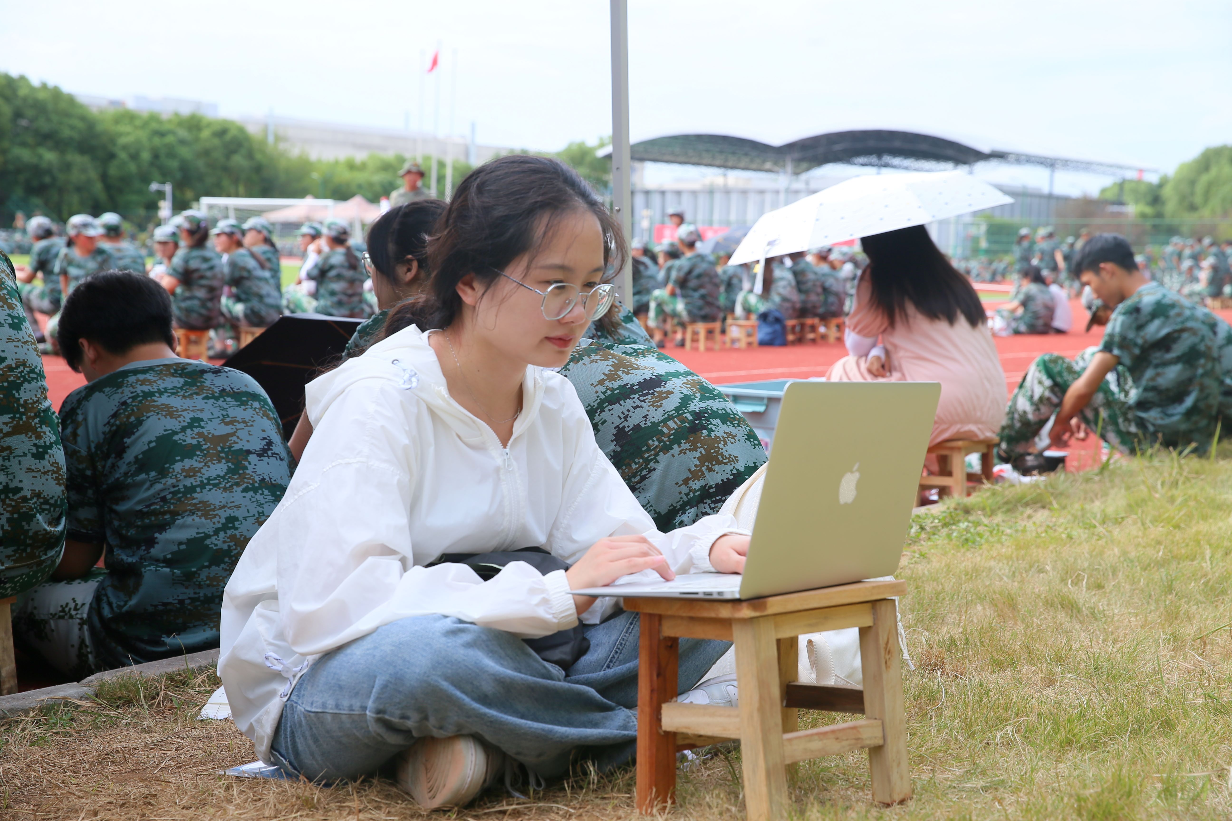 一台电脑,一沓资料,一杯水,周晗就这样直接将工位“搬”到了操场。从早上八点新生上操开始训练,到晚上八点半下训回寝,在武汉每天35℃的高温下,她依旧坚持每天早早到操场,最后一个离开,不打伞、不吹电风扇、吃喝都同新生一起,从9月5日新生正式军训到22日军训闭营,周晗一坚持就是18天。