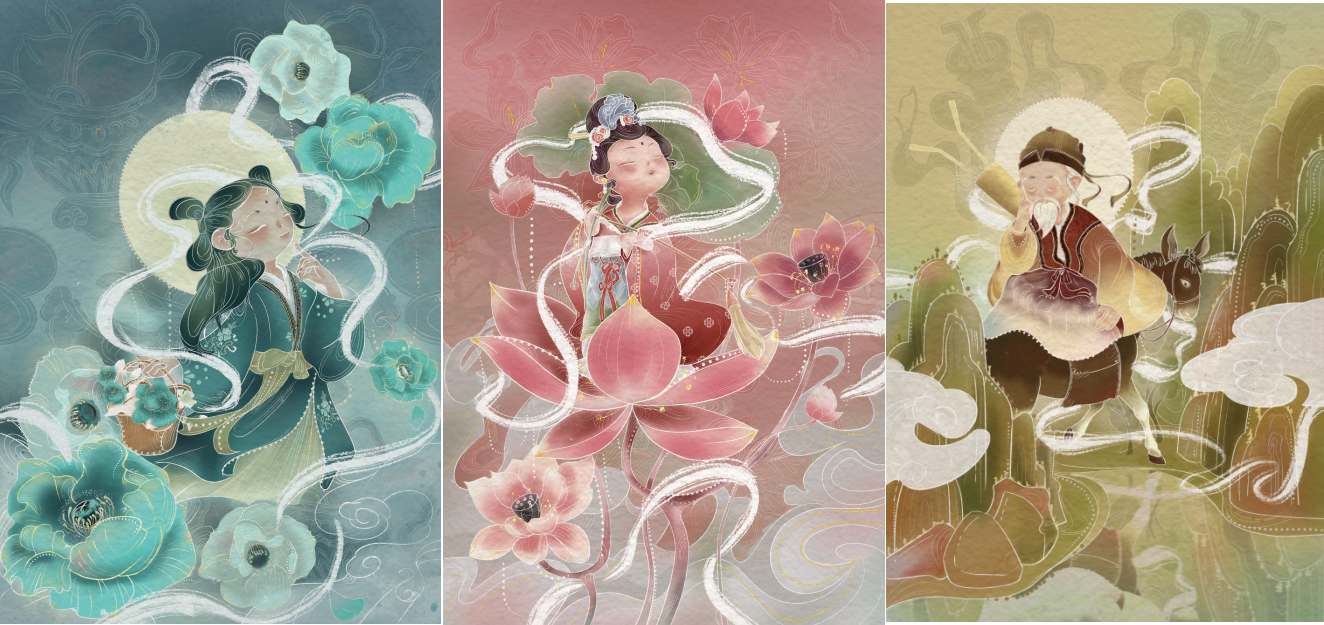 在确定主题后,陈永守拿起画笔便开始了创作——身傍莲花的何仙姑、手握兰草的蓝采和、背着葫芦的铁拐李……经过不断的修改与调整,一位又一位神仙跃然纸上,栩栩如生。通过若干幅独立的插画,按传统的卷轴画方式展开,在展开的过程中逐一呈现每一幅单独的画面,八位神仙依次露面,最终展现出了八仙过海的场景。陈永守介绍道:“八仙不是生而为仙,而是来自民间,代表了芸芸众生的各色姿态,是新时代各族人民共同奋斗历程的投影!”
