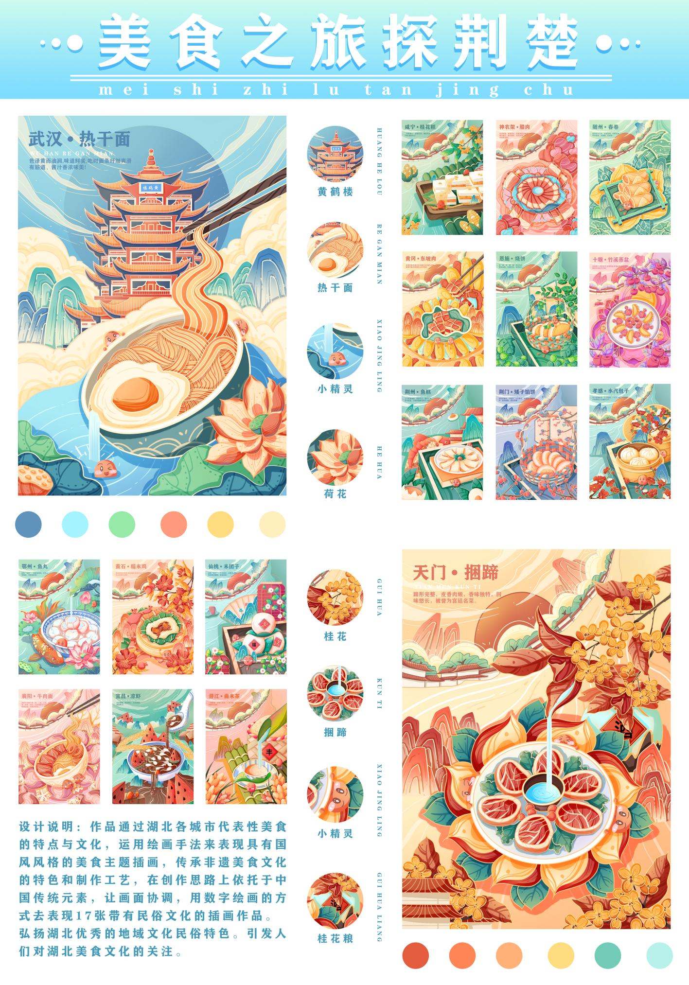 张羽彤创作的系列插画《美食之旅探荆楚》以湖北美食为题材,通过绘画对湖北特色美食进行深入刻画,用湖北美食讲好湖北故事。“在当今复杂的信息化时代,美食作为城市的明信片起到了重要作用,而用数字艺术呈现地域美食,是传播地方特色文化的有效载体。”指导老师周宇教授如是说。