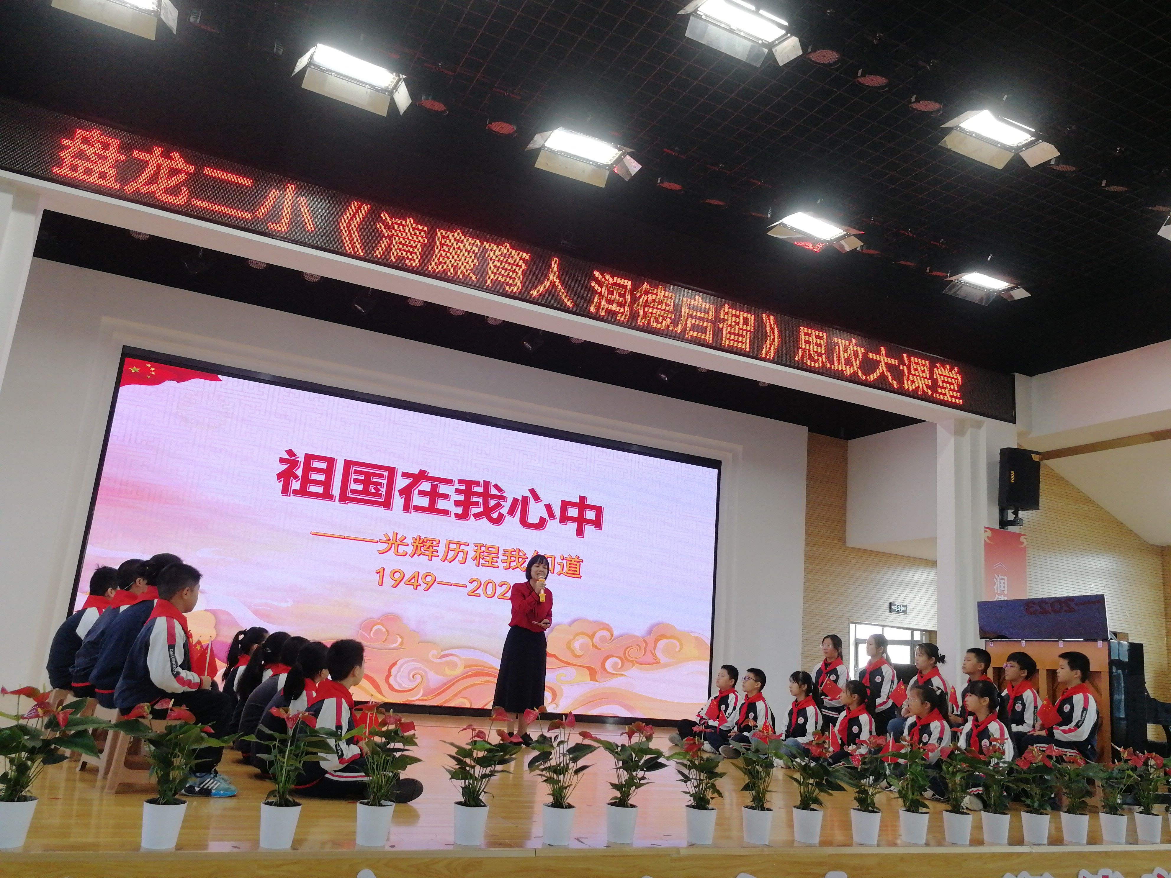 在课堂观摩环节,与会代表现场观摩学习了盘龙经济开发区第二小学《思政大课堂》第一期的展示活动。盘龙二小青年骨干教师胡炼炼以一段杭州亚运会的视频导入,给五六年级同学们带来了一节不一样的清廉育人大课堂。“当五星红旗一次又一次冉冉升起,当国歌一次又一次响彻亚运会会场,无数国人为之振奋,爱国之情在每个中华儿女的心间流淌,你有什么想说的吗?”接着,她从“党的光辉历程我知道”“课本里的爱国知识”“爱国知识大比拼”“采访视频表心声”“爱国故事我来讲“等环节,深入浅出地引领同学们在红色文化里遨游。爱国情,从点滴着手;爱国志,牢记于心。同学们随着胡炼炼老师一起感受爱国情,强爱国志。她将视频播放、红色故事、经典朗诵、唱响红歌串联其中,展现了盘龙二小莘莘学子学党史、强信念、跟党走、倡清廉、强国志的时代风貌。“我要把最美的青春献给你,我的母亲,我的祖国!”一首《我爱你中国》大气磅礴,让活动升华,点燃了大家的爱国热情,让人热血沸腾。盘龙二小100余名学生在教室里通过实况直播,共同参与了此次大思政课。