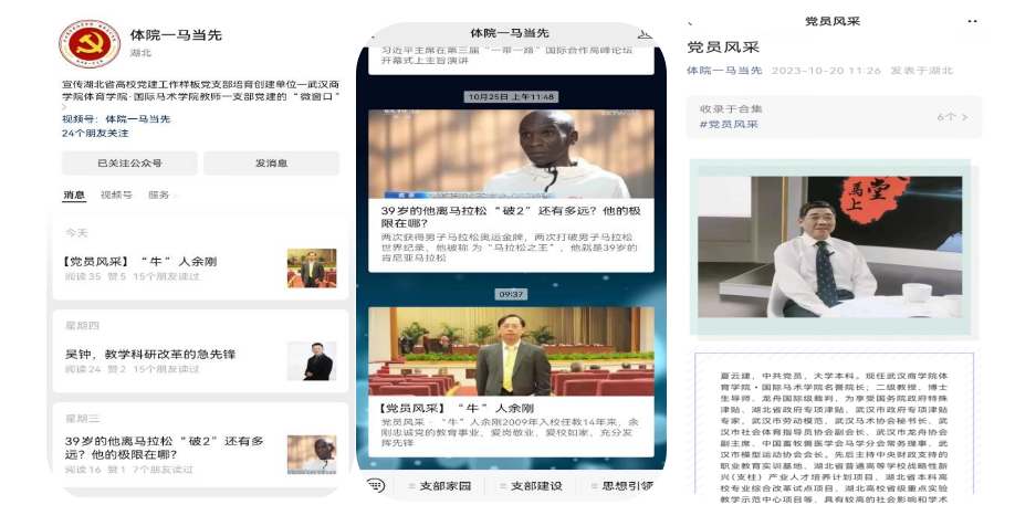 “体院——一马当先”微信公众号是体育学院·国际马术学院教师第一党支部在创建“全省党建工作样板支部”过程中倾力打造的一个重要工作平台,通过支部家园、支部建设、思想引领等板块,将支部的好经验、好做法、好成效以及优秀共产党员、先进集体的事迹,进行展示交流,让各级党组织、党员之间相互学习借鉴,形成比学赶帮超的良好局面,切实提升支部党建工作的知名度和影响力。