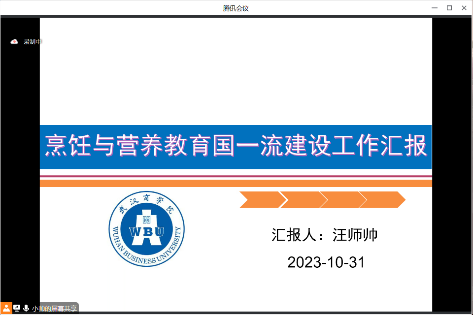 本网讯 10月31日晚上,食品科技学院召开了烹饪与营养教育专业“国一流”建设点阶段性检查线上报告会。会议邀请华中农业大学教授李斌、湖北工业大学教授苏江涛、武汉工程大学教授赵喜红听取专业建设汇报并作指导。食品科技学院杨军院长、烹饪与营养教育专业全体教师、各专业带头人及培养对象、教务科与各教研室负责人参加了会议,本次会议由副院长眭红卫主持。