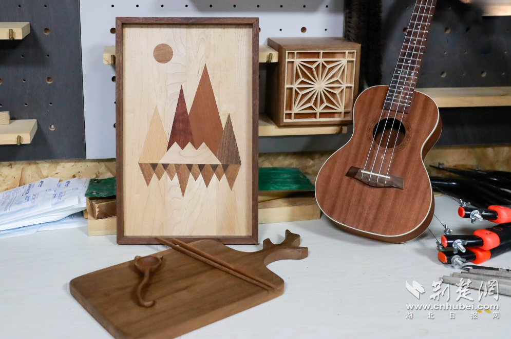 打磨、抛光、上色、上蜡油……张洁瑕展示了学生作品,桌面摆件、纯木戒指、树脂耳饰、木梳等充满艺术与工匠气息。