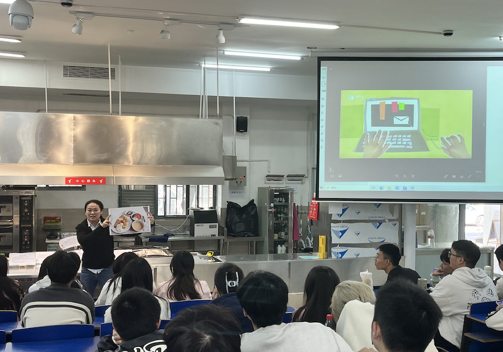 本网讯 11月7日下午,一堂别开生面的德语课在食品科技学院实训室如火如荼地开展。不同于传统的语言课堂,国际教育学院罗昊玭和李小芬两位主讲老师变更授课场所,以“舌尖上的德国”为主题,把一样样德国美食搬进教室,邀请全体21级物流管理(中外合作办学)专业的学生前来品尝。一同受邀的还有我校在德国两所合作大学的Clarke老师和Morgenroth老师。